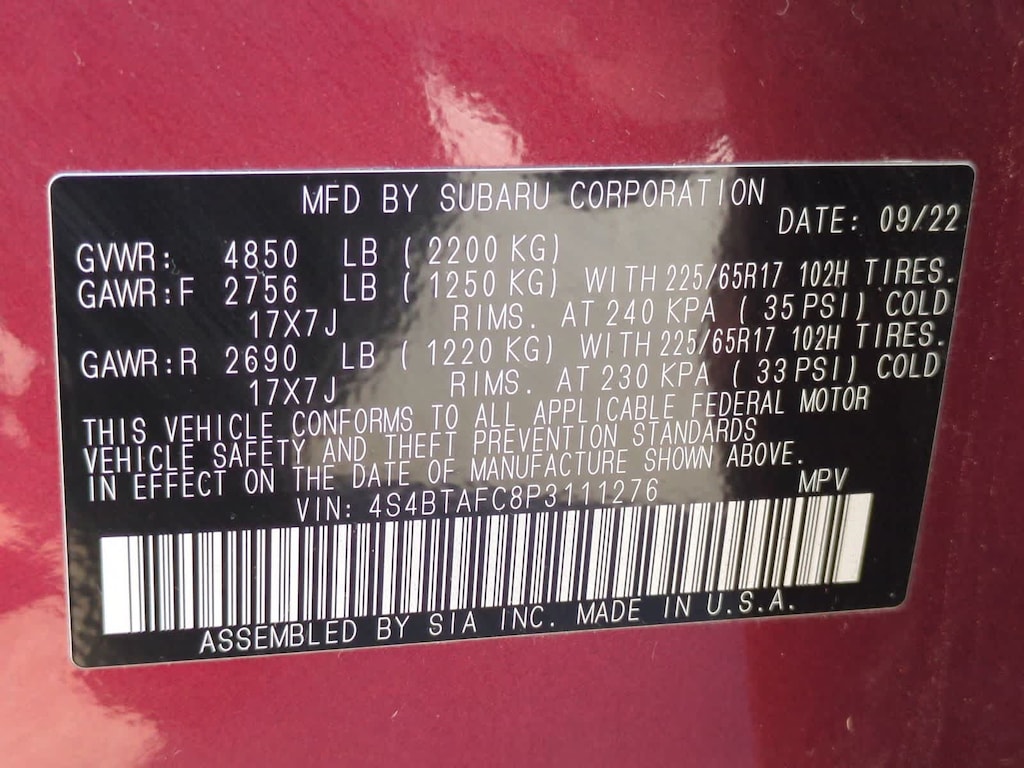CARFAX One-Owner. Clean CARFAX. Certified. Crimson Red Pearl 2023 Subaru Outback Premium AWD CVT Lineartronic 2.5L 4-Cylinder DOHC 16V Subaru Certified Pre-Owned Certified, 3.90 Axle Ratio, 4-Wheel Disc Brakes, 6 Speakers, ABS brakes, Air Conditioning, All-Weather Floor Liners, Alloy wheels, AM/FM radio: SiriusXM, Auto High-beam Headlights, Auto-Dimming Exterior Mirror w/Approach Light, Auto-Dimming Mirror w/Compass & HomeLink, Automatic temperature control, Blind Spot Detection (BSD), Brake assist, BSD & RCTA & Keyless Access & Push Button Start, Bumpers: body-color, Cargo Net, Cargo Separator, Chrome Rear Gate Trim, Cloth Upholstery, Driver door bin, Driver vanity mirror, Dual front impact airbags, Dual front side impact airbags, Electronic Stability Control, Emergency communication system: STARLINK Safety Plus (3-year free trial), Exterior Parking Camera Rear, Footwell Illumination Kit, Four wheel independent suspension, Front anti-roll bar, Front Bucket Seats, Front Center Armrest w/Storage, Front dual zone A/C, Front fog lights, Front reading lights, Fully automatic headlights, Hands-Free Power Rear Gate, Heated door mirrors, Heated Front Bucket Seats, Heated front seats, Illuminated entry, Keyless Access w/Push Button Start, Knee airbag, Leather Shift Knob, Leather steering wh