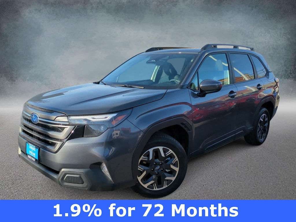 Gray Metallic 2026 Subaru Forester Premium AWD Lineartronic CVT 2.5L 4-Cylinder DOHC 16V 4-Wheel Disc Brakes, 6 Speakers, ABS brakes, Air Conditioning, Alloy wheels, AM/FM radio: SiriusXM with 360L, Anti-whiplash front head restraints, Auto High-beam Headlights, Auto-Dimming Exterior Mirror with Approach Light, Auto-Dimming Mirror with Compass and HomeLink, Automatic Emergency Steering, Automatic temperature control, Blind-Spot Detection (BSD)/RCTA System, Brake assist, Bumpers: body-color, Driver door bin, Driver vanity mirror, Dual front impact airbags, Dual front side impact airbags, Electronic Stability Control, Emergency communication system: MySubaru Companion (5-years free), Emergency Lane Keep Assist, Exterior Parking Camera Rear, Four wheel independent suspension, Front anti-roll bar, Front Bucket Seats, Front Center Armrest, Front dual zone A/C, Front fog lights, Front reading lights, Fully automatic headlights, Heated door mirrors, Heated Front Bucket Seats, Heated front seats, Illuminated entry, Knee airbag, Leather steering wheel, Low tire pressure warning, Occupant sensing airbag, Outside temperature display, Overhead airbag, Overhead console, Panic alarm, Passenger door bin, Passenger vanity mirror, Power door mirrors, Power driver seat, Power moonroof: Panoramic, Power Rear Gate, Power Rear Gate and Blind Spot Detection with Rear Cross Traffic Alert, Power steering, Power windows, Premium Textured Cloth Upholstery, Radio data system, Radio: Subaru 11.6 Multimedia Plus System, Rear anti-roll bar, Rear seat center armrest, Rear window defroster, Rear window wiper, Remote keyless entry, Security system, Speed control, Speed-sensing steering, Split folding rear seat, Spoiler, Steering wheel mounted audio controls, Tachometer, Telescoping steering wheel, Tilt steering wheel, Traction control, Trip computer, Variably intermittent wipers, Wheels: 17 x 7.0 J Dark Metallic Aluminum-Alloy.