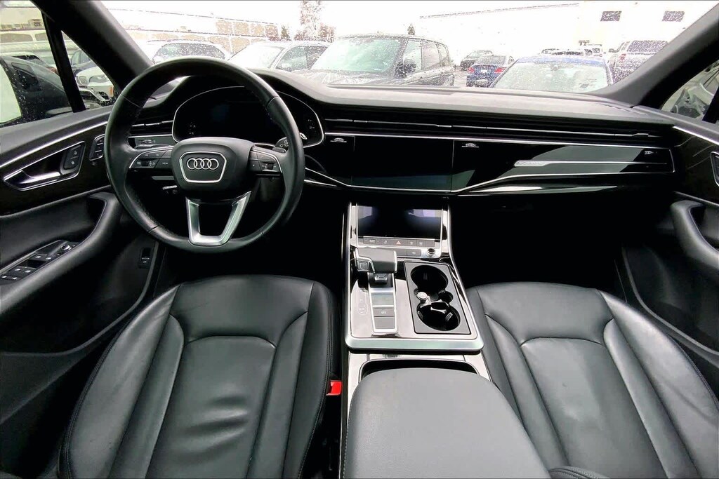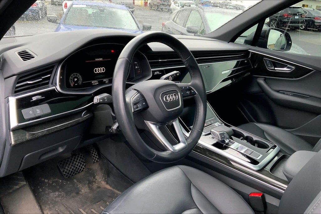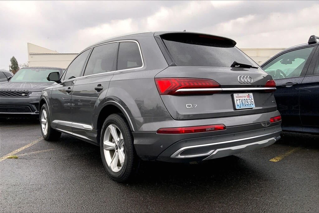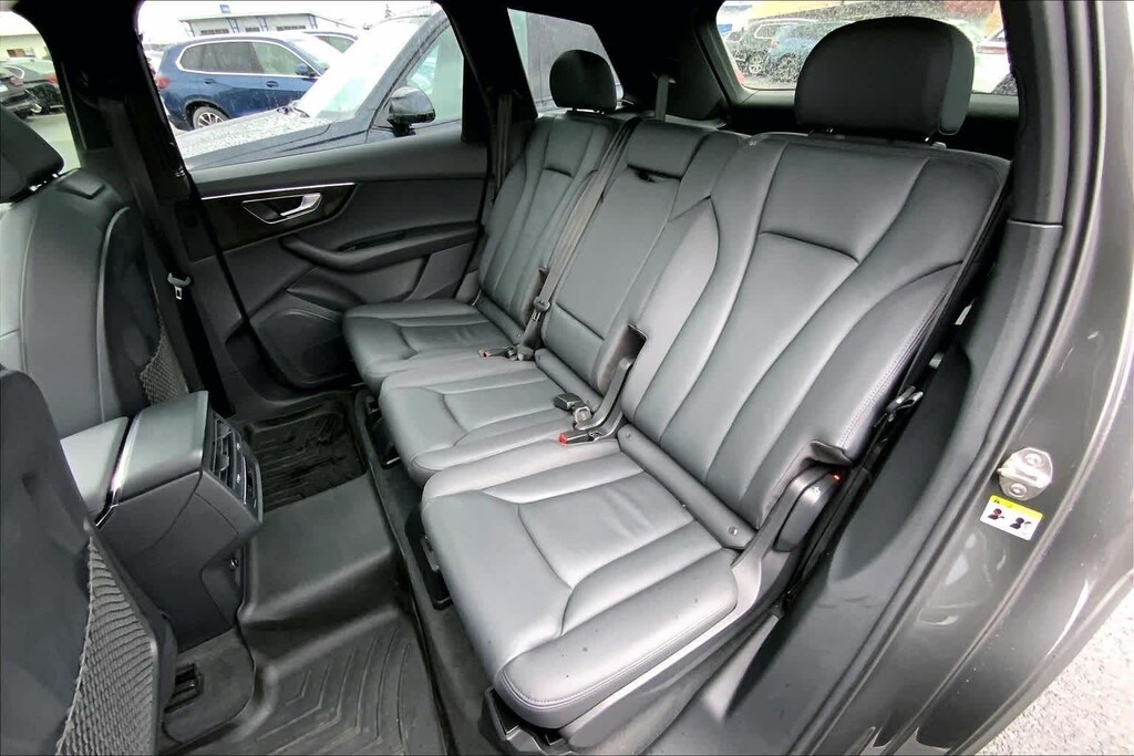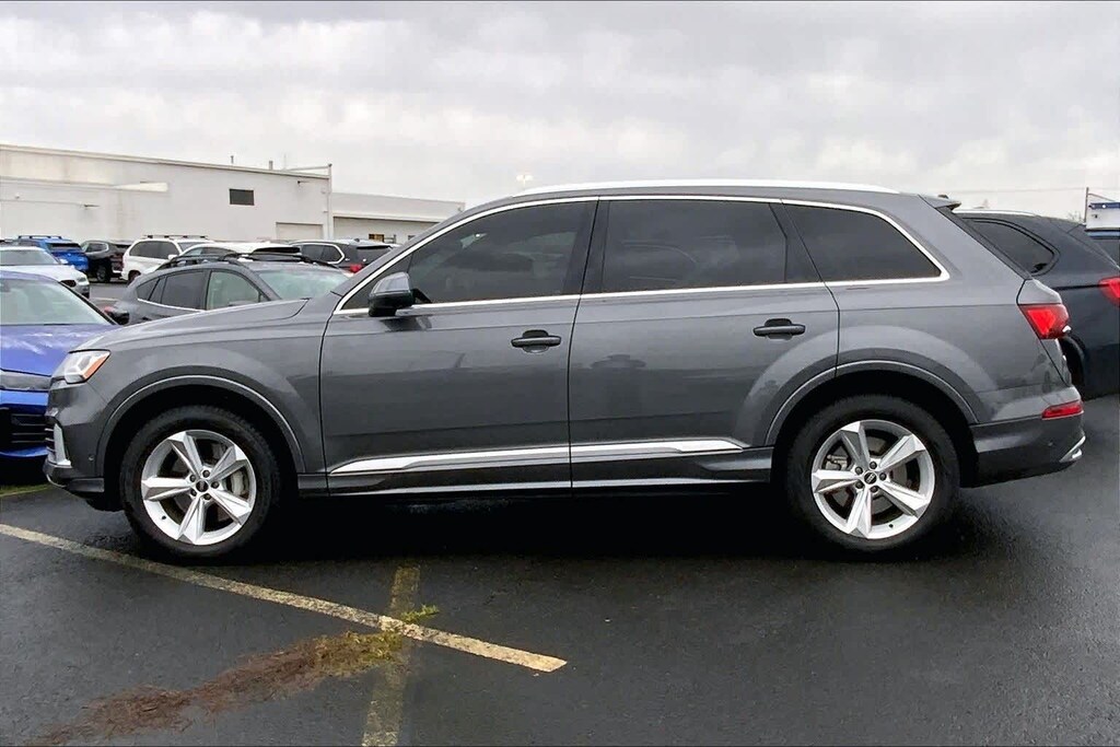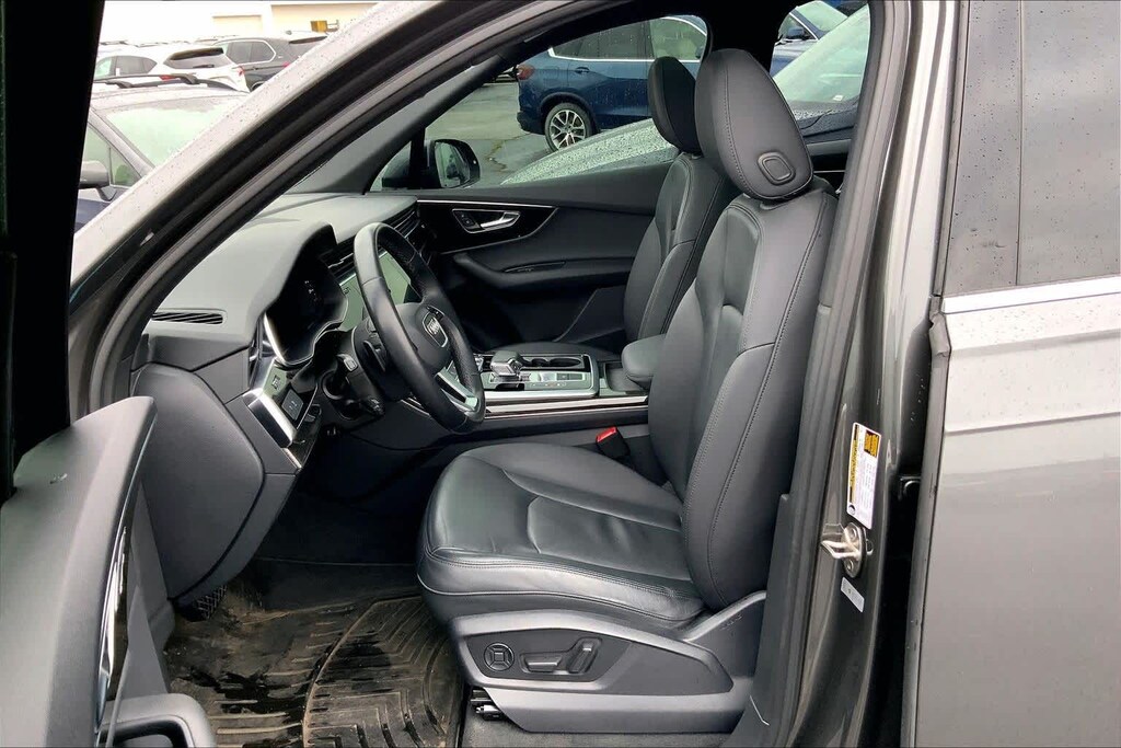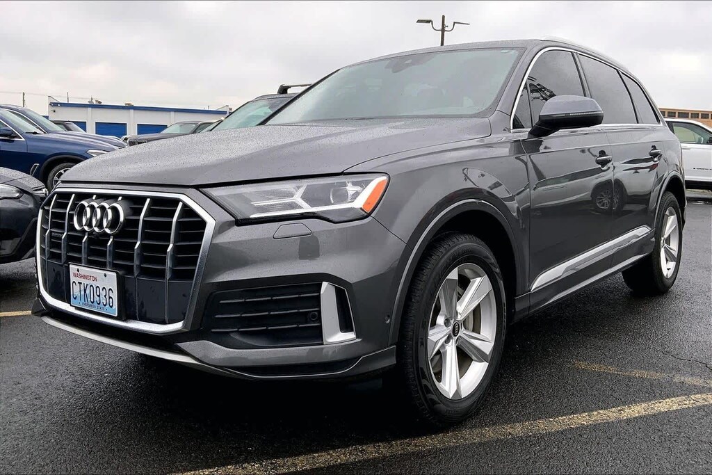 Clean CARFAX. Gray Metallic 2021 Audi Q7 45 Premium quattro quattro 8-Speed Automatic with Tiptronic 2.0L 4-Cylinder TFSI 10 Speakers, 3-Spoke Multifunction Steering Wheel w/Paddles, 3.76 Axle Ratio, 3rd row seats: bench, 4-Wheel Disc Brakes, ABS brakes, Air Conditioning, Alloy wheels, AM/FM radio: SiriusXM, Ambient Interior Lighting Package, Audi Guard Protection Kit, Audi Phone Box w/Wireless Charging, Audi smartphone interface (Apple CarPlay/Android Auto), Auto High-beam Headlights, Auto-dimming Rear-View mirror, Automatic temperature control, Black Cloth Headliner, Brake assist, Bumpers: body-color, Compass, Convenience Package, Delay-off headlights, Driver door bin, Driver vanity mirror, Dual front impact airbags, Dual front side impact airbags, Electronic Stability Control, Emergency communication system: Audi connect CARE, PRIME & PLUS, Exterior Parking Camera Rear, Four wheel independent suspension, Front & Rear Doors Audi Beam-Rings, Front anti-roll bar, Front Bucket Seats, Front Center Armrest, Front dual zone A/C, Front fog lights, Front reading lights, Fully automatic headlights, Garage door transmitter: HomeLink, Genuine wood door panel insert, Heated Auto-Dimming Power Folding Exterior Mirrors, Heated door mirrors, Heated Front Bucket Seats, Heated front seats, Illuminated entry, Leather Seating Surfaces, Leather Shift Knob, Leather steering wheel, Low tire pressure warning, Memory seat, Navigation system: Audi MMI Navigation plus with Touch Response, Occupant sensing airbag, Outside temperature display, Overhead airbag, Overhead console, Panic alarm, Passenger door bin, Passenger vanity mirror, Power door mirrors, Power driver seat, Power Liftgate, Power moonroof, Power passenger seat, Power steering, Power windows, Privacy Trunk Cover, Radio data system, Radio: Audi Sound System, Rain sensing wipers, Rear air conditioning, Rear anti-roll bar, Rear fog lights, Rear reading lights, Rear seat center armrest, Rear window defroster, Rear window wiper, Reclining 3rd row seat, Remote keyless entry, Roof rack: rails only, Security system, Speed control, Speed-sensing steering, Split folding rear seat, Spoiler, Steering wheel memory, Steering wheel mounted audio controls, Tachometer, Telescoping steering wheel, Tilt steering wheel, Topview Camera System, Traction control, Trip computer, Turn signal indicator mirrors, USB Cables, Variably intermittent wipers, Wheels: 19 5-Arm-Star Design.