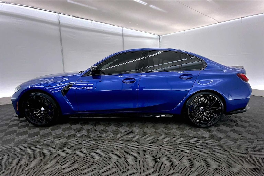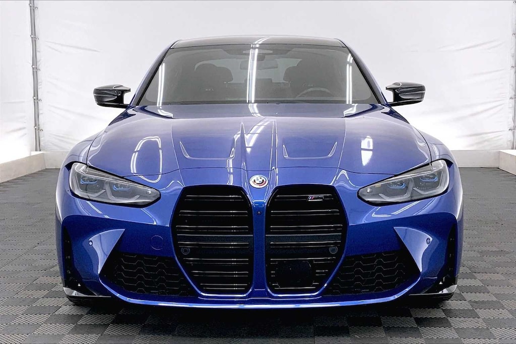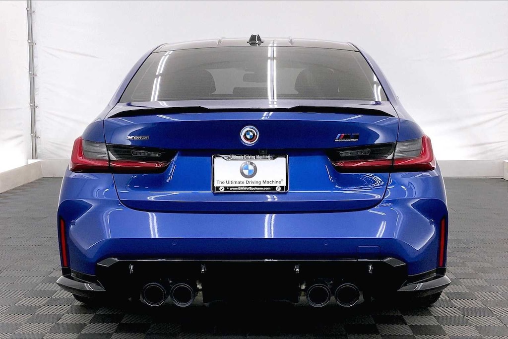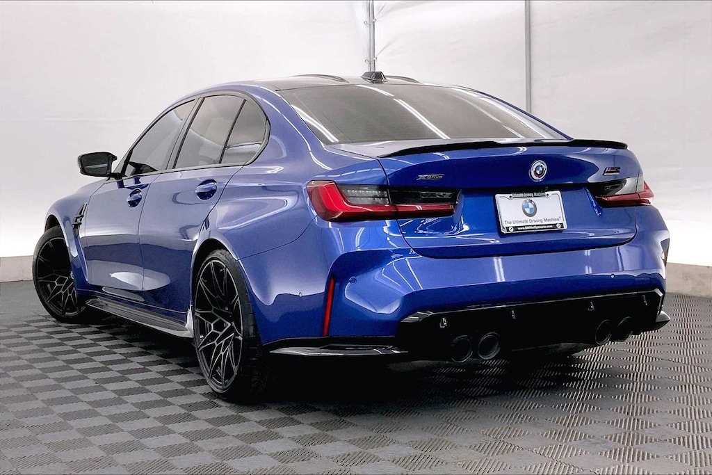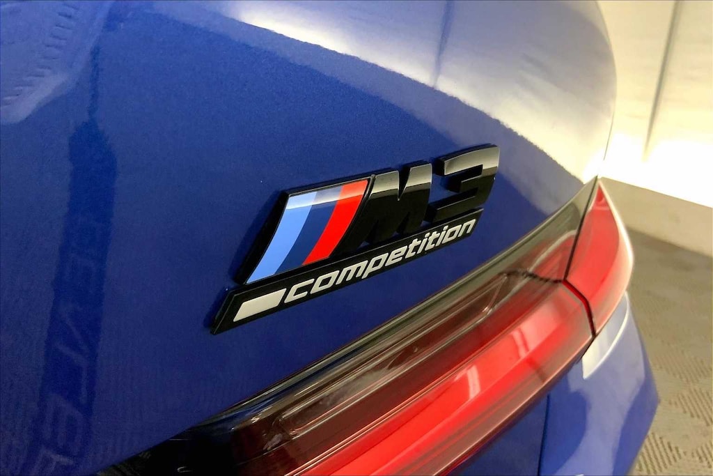 CARFAX One-Owner. Clean CARFAX. Portimao Blue Metallic 2023 BMW M3 Competition AWD 8-Speed Automatic Steptronic 3.0L I6 Turbocharged DOHC 24V LEV3-ULEV70 503hp 16 Speakers, 4-Wheel Disc Brakes, ABS brakes, Active Driving Assistant Pro, Adaptive suspension, Air Conditioning, Alloy wheels, AM/FM radio: SiriusXM, Apple CarPlay & Android Auto Compatibility, Auto High-beam Headlights, Auto-dimming door mirrors, Auto-dimming Rear-View mirror, Automatic temperature control, BMW Assist eCall, BMW Curved Display, BMW Head Up Display, BMW TeleServices, Brake assist, Bumpers: body-color, Compass, Connected Package Pro, ConnectedDrive Services, Delay-off headlights, Drive Recorder, Driver door bin, Driver vanity mirror, Driving Assistance Professional Package, Dual front impact airbags, Dual front side impact airbags, Electronic Stability Control, Emergency communication system: BMW Assist eCall, Enhanced USB & Bluetooth Plus Smartphone Integration, Executive Package, Extended Merino Leather Upholstery, Extended Traffic Jam Assistant, Exterior Parking Camera Rear, Four wheel independent suspension, Front anti-roll bar, Front Bucket Seats, Front Center Armrest, Front dual zone A/C, Front reading lights, Front Ventilated Seats, Fully automatic headlights, Garage door transmitter, harman/kardon Surround Sound System, harman/kardonî Speakers, Heated door mirrors, Heated Front Seats, Heated front seats, Heated Steering Wheel, Icon Adaptive LED Headlights w/Laserlight, Illuminated entry, Knee airbag, Leather Shift Knob, Low tire pressure warning, Lumbar Support, M Drive Professional, M Drivers Package, M Shadowline Lights, M Sport Seats, Memory seat, Navigation System, Occupant sensing airbag, Outside temperature display, Overhead airbag, Panic alarm, Parking Assistance Package, Parking Assistant Plus, Passenger door bin, Passenger vanity mirror, Personal eSIM 5G, Power door mirrors, Power driver seat, Power Front Seats, Power passenger seat, Power steering, Power Tailgate, Power windows, Radio data system, Radio: AM/FM Audio System, Rain sensing wipers, Rear air conditioning, Rear anti-roll bar, Rear reading lights, Rear window defroster, Remote Engine Start, Remote keyless entry, Security system, SensaTec Dashboard, SiriusXM Satellite Radio w/1 Year Subscription, Speed control, Speed-sensing steering, Speed-Sensitive Wipers, Split folding rear seat, Spoiler, Sport steering wheel, Steering wheel mounted audio controls, Tachometer, Telescoping steering wheel, Tilt steering wheel, Traction control, Trip computer, Turn signal indicator mirrors, Variably intermittent wipers, Wheels: 19x9.5 Fr.&20x10.5Rr. M Bi-color (1T8), Wireless Device Charging.