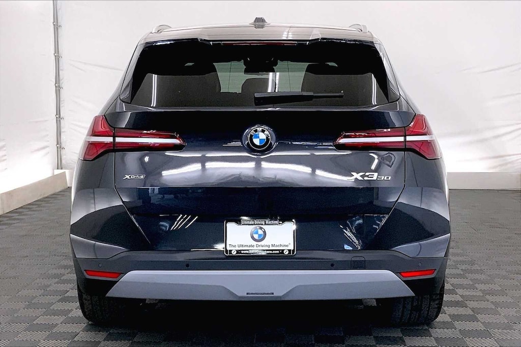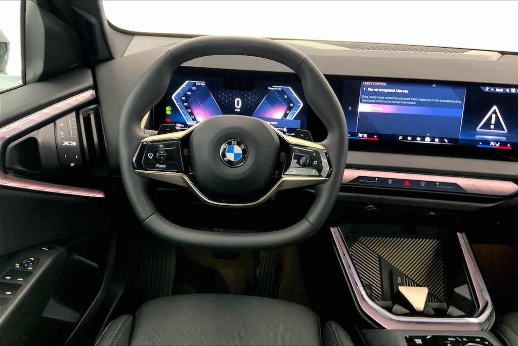 CARFAX One-Owner. Clean CARFAX. Dark Graphite Metallic 2025 BMW X3 30 xDrive AWD 8-Speed Automatic I4 8-Speed Automatic, 12 Speakers, 4-Wheel Disc Brakes, ABS brakes, Air Conditioning, Alloy wheels, AM/FM Radio, AM/FM radio: SiriusXM, Apple CarPlay and Android Auto Compatibility, Auto High-beam Headlights, Auto-dimming door mirrors, Auto-dimming Rear-View mirror, Automatic temperature control, BMW Assist ECall, BMW TeleServices, Brake assist, Bumpers: body-color, Delay-off headlights, Driver door bin, Driver vanity mirror, Dual front impact airbags, Dual front side impact airbags, Electronic Stability Control, Emergency communication system: BMW Assist eCall, Exterior Parking Camera Rear, Four wheel independent suspension, Front anti-roll bar, Front Bucket Seats, Front Center Armrest, Front dual zone A/C, Front reading lights, Fully automatic headlights, Garage door transmitter, Heated door mirrors, Heated Front Seats, Heated front seats, Heated Steering Wheel, Hi-Fi Sound System, Illuminated entry, Knee airbag, Low tire pressure warning, Lumbar Support, Memory seat, Navigation, Navigation system: BMW Maps Navigation, Occupant sensing airbag, Outside temperature display, Overhead airbag, Overhead console, Panic alarm, Passenger door bin, Passenger vanity mirror, Personal ESIM 5G, Power door mirrors, Power driver seat, Power Front Seats, Power Liftgate, Power passenger seat, Power steering, Power windows, Radio data system, Rain sensing wipers, Rear anti-roll bar, Rear reading lights, Rear seat center armrest, Rear window defroster, Rear window wiper, Remote keyless entry, Security system, SiriusXM Satellite Radio with 1 Year Subscription, Speed control, Speed-Sensitive Wipers, Split folding rear seat, Spoiler, Sport Seats, Sport steering wheel, Steering wheel mounted audio controls, Tachometer, Telescoping steering wheel, Tilt steering wheel, Traction control, Trip computer, Turn signal indicator mirrors, Variably intermittent wipers, Veganza Perforated and Quilted Upholstery, Wheels: 19 x 8.5 Aero Midnight Grey Bicolor, Wheels: 21 x 9 Front and 21 x 10.5 Rear Individual, Wireless Device Charging, 8-Speed Automatic.