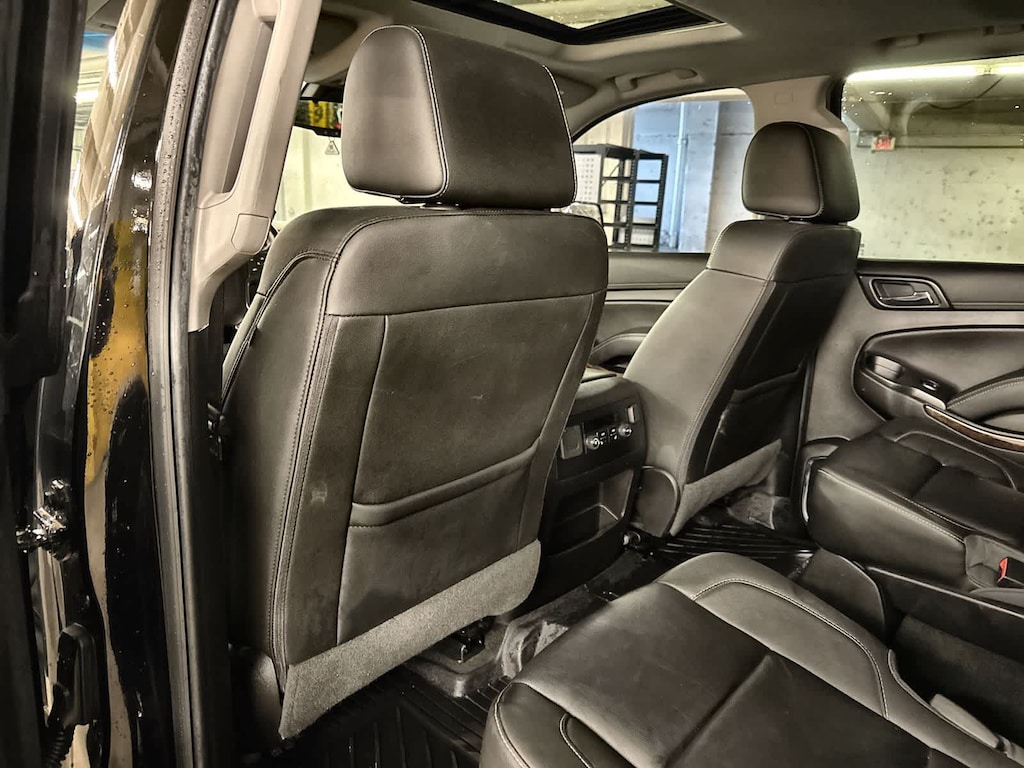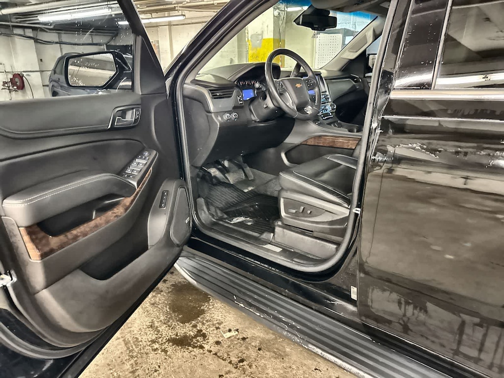 Clean CARFAX. Black 2018 Chevrolet Tahoe LT 4WD 6-Speed Automatic Electronic with Overdrive EcoTec3 5.3L V8 4WD, Black Leather, 18 x 8.5 Aluminum Wheels, 1st & 2nd Row Color-Keyed Carpeted Floor Mats, 2nd Row 60/40 Split-Folding Manual Bench, 2nd Row Pwr Release 60/40 Split Folding Bench Seat, 3.08 Rear Axle Ratio, 3rd Row 60/40 Power Fold Split-Bench, 3rd Row Manual 60/40 Split-Folding Fold Flat Bench, 3rd row seats: split-bench, 4-Wheel Antilock Disc Brakes w/Brake Assist, 4-Wheel Disc Brakes, 5 12-Volt Auxiliary Power Outlets, 9 Speakers, ABS brakes, Adjustable pedals, Air Conditioning, All-Weather Floor Liner Package (LPO), Alloy wheels, AM/FM radio: SiriusXM, Apple CarPlay/Android Auto, Auto High-beam Headlights, Auto-Dimming Inside Rear-View Mirror, Auto-dimming Rear-View mirror, Automatic temperature control, Black Assist Steps, Bluetoothî For Phone, Bose Premium 9-Speaker System, Brake assist, Bumpers: body-color, Cargo Net, CD player, Color-Keyed Carpeting Floor Covering, Compass, Delay-off headlights, Driver door bin, Driver Inboard & Front Passenger Airbags, Driver vanity