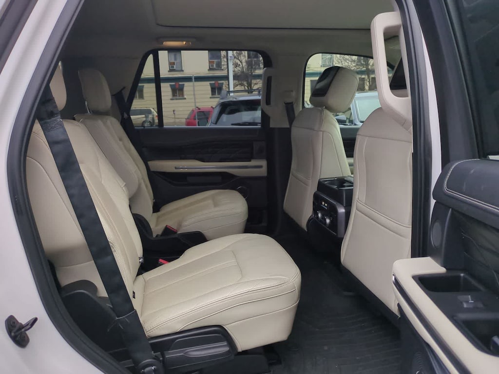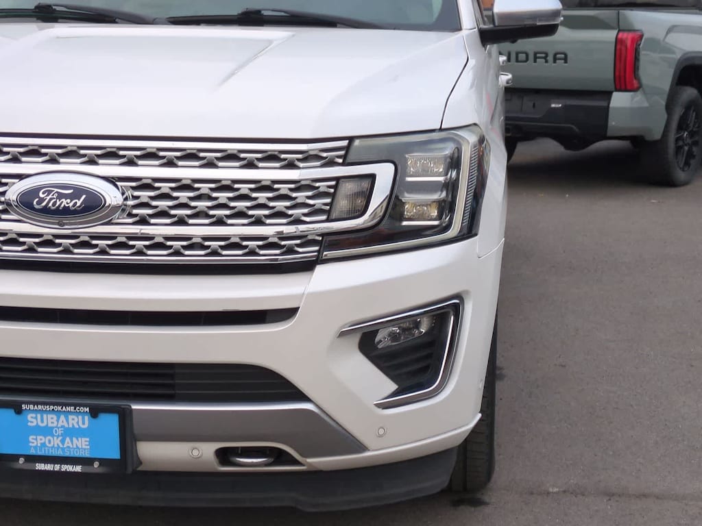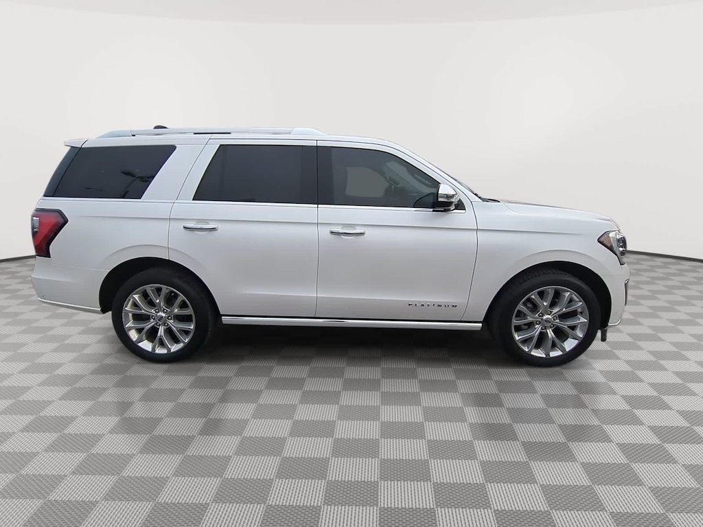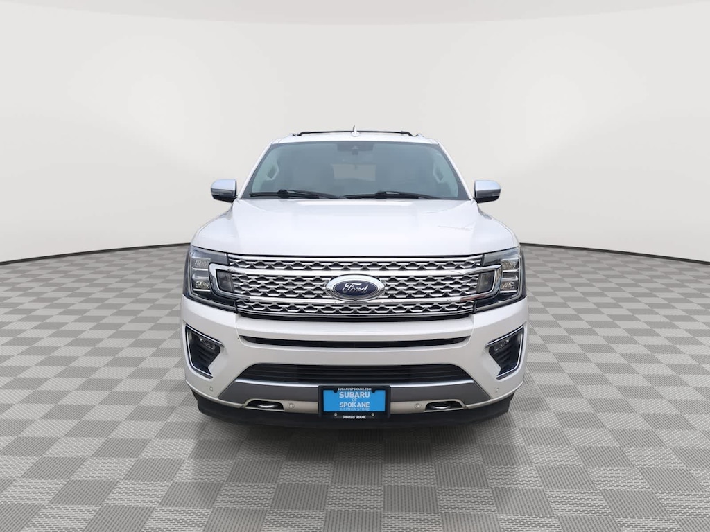 Clean CARFAX. White Platinum 2019 Ford Expedition Platinum 4WD 10-Speed Automatic EcoBoost 3.5L V6 GTDi DOHC 24V Twin Turbocharged 4WD, 12 Speakers, 22 Polished Aluminum Wheels, 2nd Row Bucket Seats, 3.31 Axle Ratio, 3rd row seats: split-bench, 4-Wheel Disc Brakes, ABS brakes, Adaptive suspension, Adjustable pedals, Air Conditioning, Alloy wheels, AM/FM radio: SiriusXM, AppLink/Apple CarPlay and Android Auto, Auto High-beam Headlights, Auto-dimming door mirrors, Auto-dimming Rear-View mirror, Automatic temperature control, Brake assist, Bumpers: body-color, Compass, Delay-off headlights, Driver door bin, Driver vanity mirror, Dual front impact airbags, Dual front side impact airbags, Dual-Headrest Rear-Seat Entertainment System, Electronic Limited Slip w/3.73 Axle Ratio, Electronic Stability Control, Emergency communication system: SYNC 3 911 Assist, Equipment Group 600A, Exterior Parking Camera Rear, Four wheel independent suspension, Front anti-roll bar, Front Bucket Seats, Front Center Armrest, Front dual zone A/C, Front fog lights, Front reading lights, Fully automatic headlights, Garage door transmitter, Genuine wood console insert, Genuine wood dashboard insert, Genuine wood door panel insert, Heated & Cooled Perforated Leather Fr Bucket Seats, Heated door mirrors, Heated front seats, Heated rear seats, Heated steering wheel, Heavy-Duty Engine Radiator, Heavy-Duty Trailer Tow Package, Illuminated entry, Integrated Trailer Brake Controller, Lane Departure Warning System, Leather steering wheel, Low tire pressure warning, Memory seat, Navigation System, Occupant sensing airbag, Outside temperature display, Overhead airbag, Overhead console, Panic alarm, Passenger door bin, Passenger vanity mirror, Pedal memory, Power door mirrors, Power driver seat, Power Liftgate, Power moonroof, Power passenger seat, Power steering, Power windows, Pro Trailer Backup Assist, Radio data system, Radio: B&O Sound System by Bang & Olufsen, Rain sensing wipers, Rear air conditioning, Rear anti-roll bar, Rear audio controls, Rear reading lights, Rear window defroster, Rear window wiper, Reclining 3rd row seat, Remote keyless entry, Reversible Cargo Mat, Roof rack, Security system, SiriusXM Satellite Radio, Speed control, Speed-sensing steering, Speed-Sensitive Wipers, Split folding rear seat, Steering wheel mounted audio co
