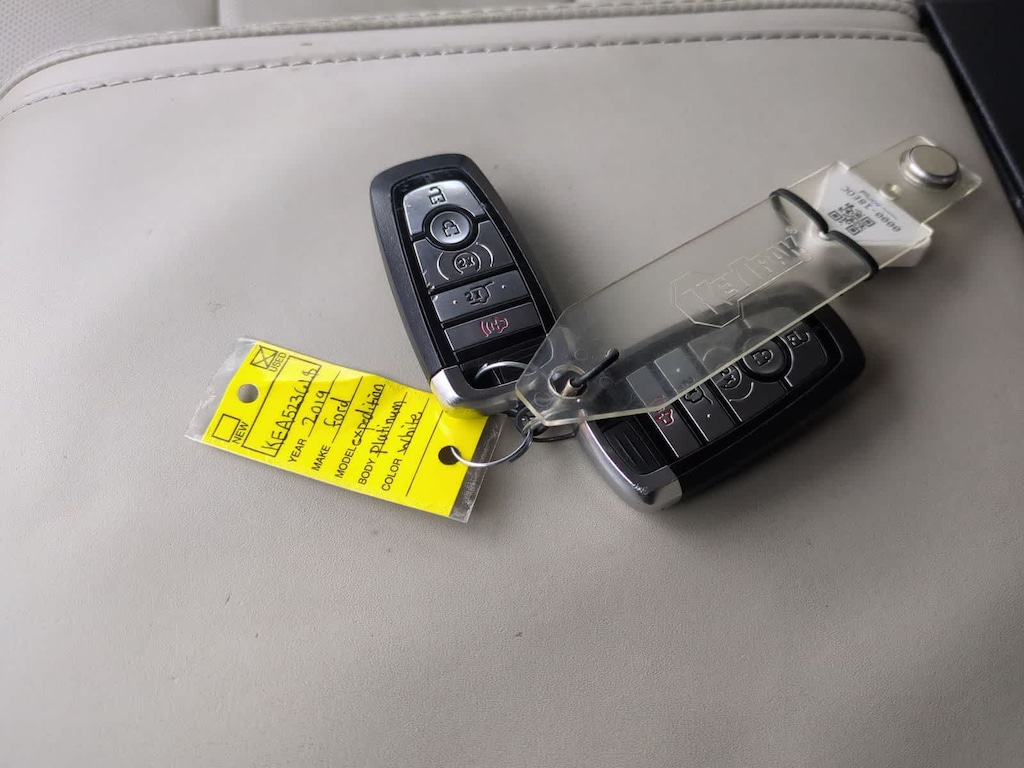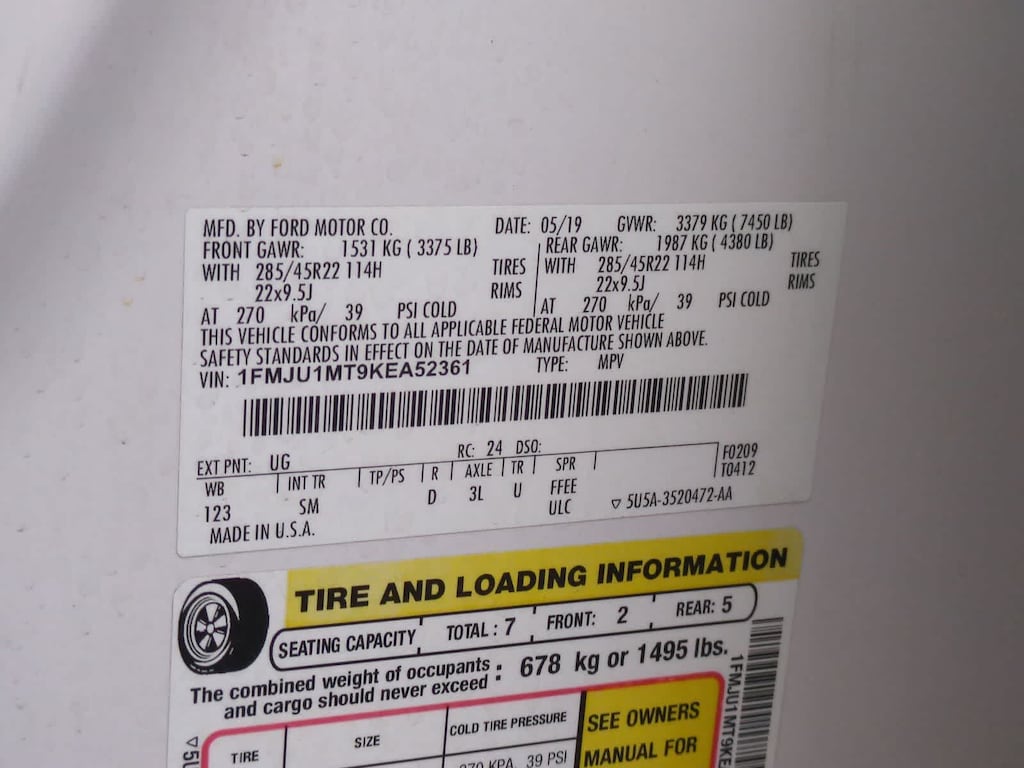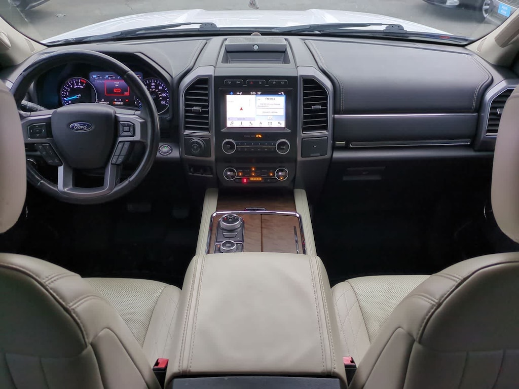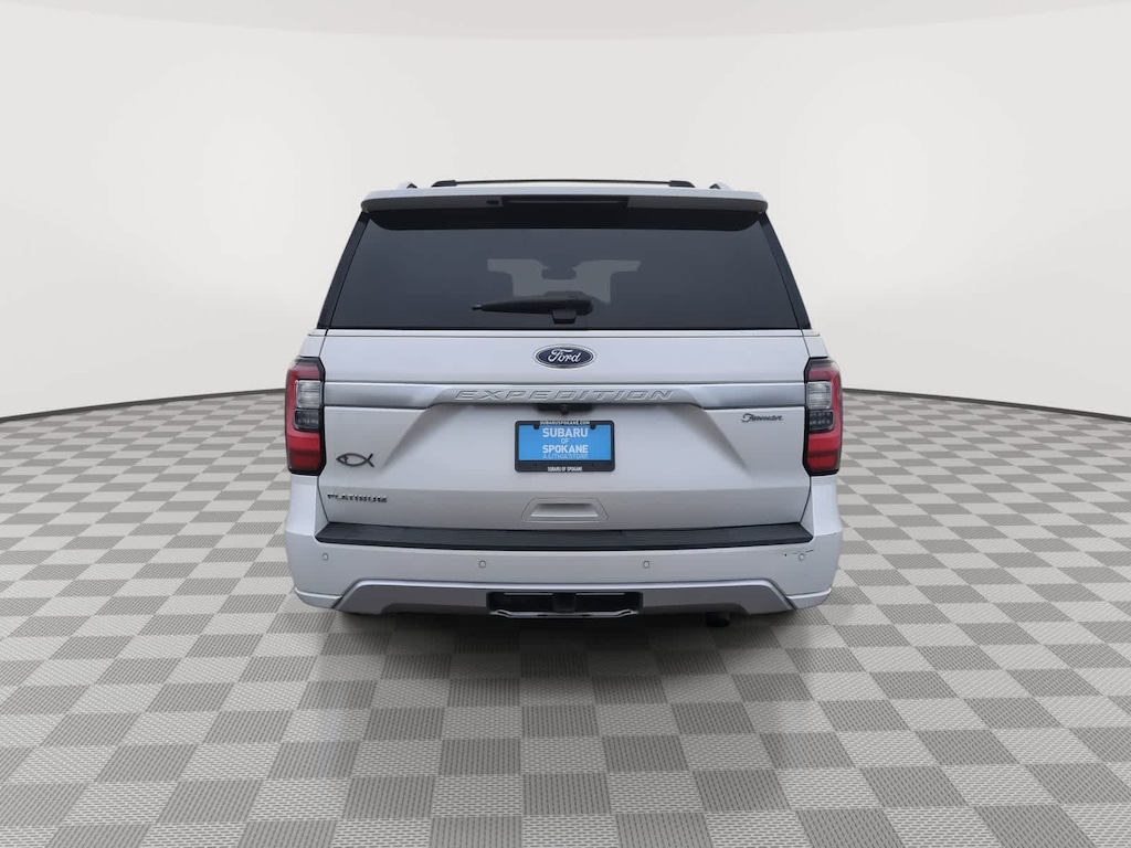 Clean CARFAX. White Platinum 2019 Ford Expedition Platinum 4WD 10-Speed Automatic EcoBoost 3.5L V6 GTDi DOHC 24V Twin Turbocharged 4WD, 12 Speakers, 22 Polished Aluminum Wheels, 2nd Row Bucket Seats, 3.31 Axle Ratio, 3rd row seats: split-bench, 4-Wheel Disc Brakes, ABS brakes, Adaptive suspension, Adjustable pedals, Air Conditioning, Alloy wheels, AM/FM radio: SiriusXM, AppLink/Apple CarPlay and Android Auto, Auto High-beam Headlights, Auto-dimming door mirrors, Auto-dimming Rear-View mirror, Automatic temperature control, Brake assist, Bumpers: body-color, Compass, Delay-off headlights, Driver door bin, Driver vanity mirror, Dual front impact airbags, Dual front side impact airbags, Dual-Headrest Rear-Seat Entertainment System, Electronic Limited Slip w/3.73 Axle Ratio, Electronic Stability Control, Emergency communication system: SYNC 3 911 Assist, Equipment Group 600A, Exterior Parking Camera Rear, Four wheel independent suspension, Front anti-roll bar, Front Bucket Seats, Front Center Armrest, Front dual zone A/C, Front fog lights, Front reading lights, Fully automatic headlights, Garage door transmitter, Genuine wood console insert, Genuine wood dashboard insert, Genuine wood door panel insert, Heated & Cooled Perforated Leather Fr Bucket Seats, Heated door mirrors, Heated front seats, Heated rear seats, Heated steering wheel, Heavy-Duty Engine Radiator, Heavy-Duty Trailer Tow Package, Illuminated entry, Integrated Trailer Brake Controller, Lane Departure Warning System, Leather steering wheel, Low tire pressure warning, Memory seat, Navigation System, Occupant sensing airbag, Outside temperature display, Overhead airbag, Overhead console, Panic alarm, Passenger door bin, Passenger vanity mirror, Pedal memory, Power door mirrors, Power driver seat, Power Liftgate, Power moonroof, Power passenger seat, Power steering, Power windows, Pro Trailer Backup Assist, Radio data system, Radio: B&O Sound System by Bang & Olufsen, Rain sensing wipers, Rear air conditioning, Rear anti-roll bar, Rear audio controls, Rear reading lights, Rear window defroster, Rear window wiper, Reclining 3rd row seat, Remote keyless entry, Reversible Cargo Mat, Roof rack, Security system, SiriusXM Satellite Radio, Speed control, Speed-sensing steering, Speed-Sensitive Wipers, Split folding rear seat, Steering wheel mounted audio co
