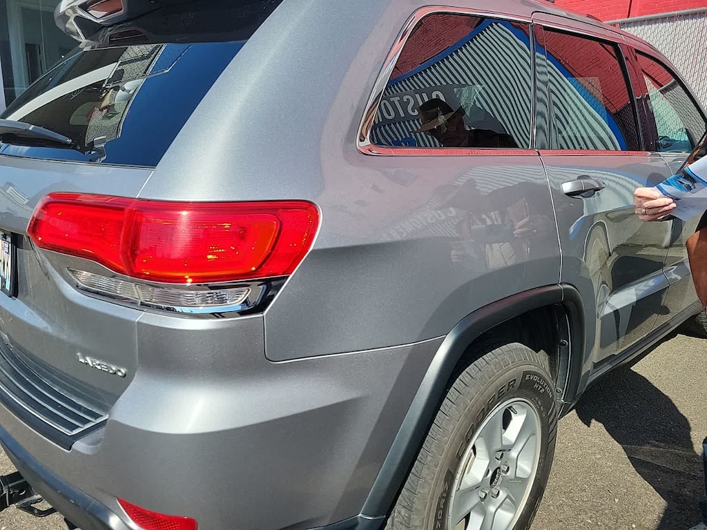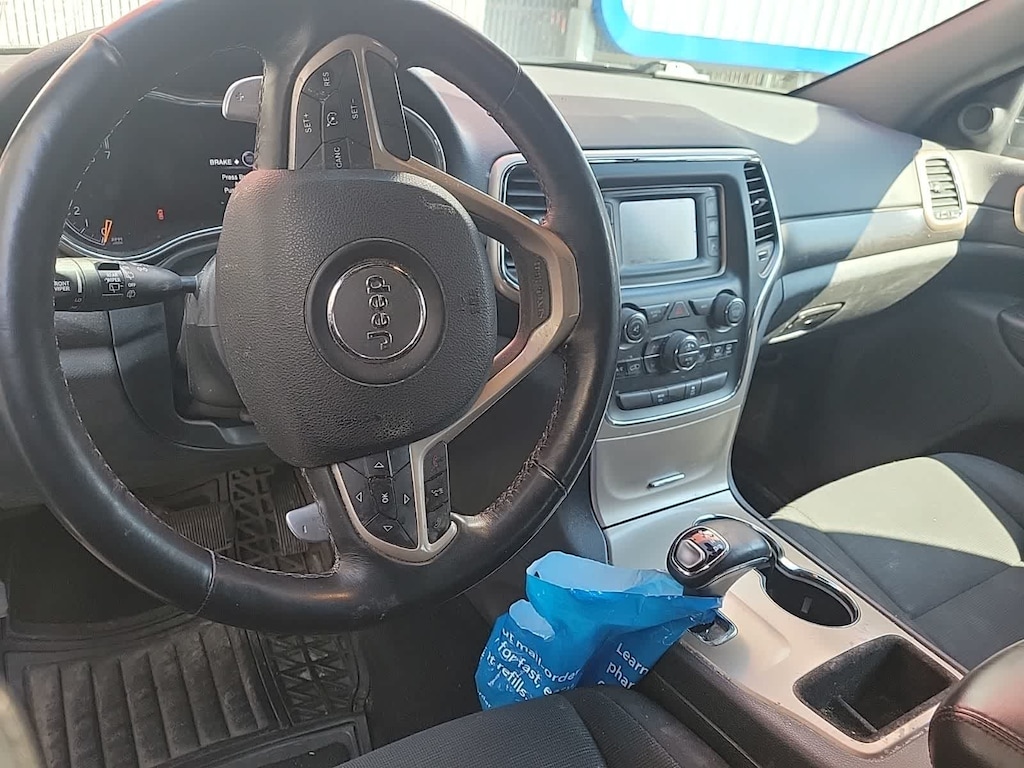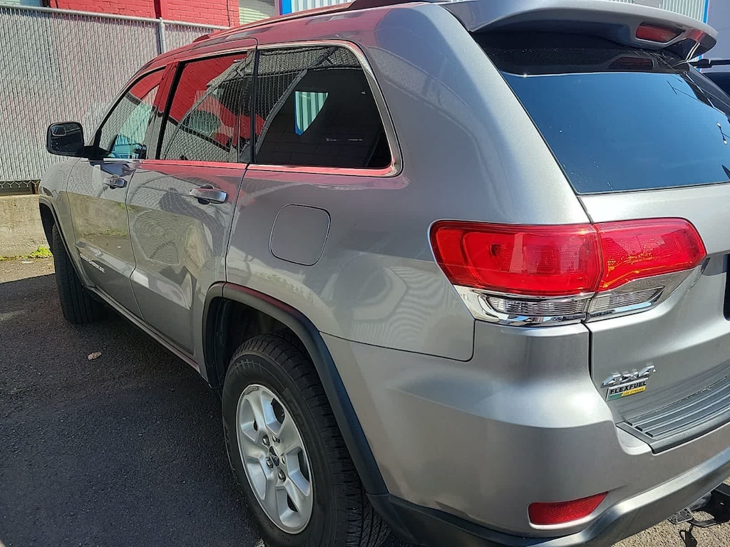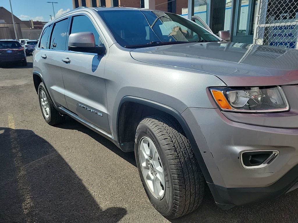 Clean CARFAX. Billet Silver Metallic Clearcoat 2015 Jeep Grand Cherokee Laredo 4WD 8-Speed Automatic 3.6L V6 24V VVT 4WD, 1-Yr. SIRIUSXM Radio Service, 115V Auxiliary Power Outlet, 17 x 8.0 Aluminum Wheels, 3.45 Rear Axle Ratio, 4-Wheel Disc Brakes, 6 Speakers, ABS brakes, Air Conditioning, Alloy wheels, AM/FM radio, Anti-whiplash front head restraints, Automatic temperature control, Brake assist, Bright Side Roof Rails, Bumpers: body-color, Cargo Compartment Cover, Cloth Low-Back Bucket Seats, Compass, Delay-off headlights, Driver door bin, Driver vanity mirror, Dual front impact airbags, Dual front side impact airbags, Electronic Stability Control, Four wheel independent suspension, Front anti-roll bar, Front Bucket Seats, Front Center Armrest w/Storage, Front dual zone A/C, Front fog lights, Front reading lights, Fully automatic headlights, Heated door mirrors, Illuminated entry, Knee airbag, Leather Shift Knob, Low tire pressure warning, Manufacturers Statement of Origin, Normal Duty Suspension, Occupant sensing airbag, Outside temperature display, Overhead airbag, Overhead console, Panic alarm, Passenger door bin, Passenger vanity mirror, Power 4-Way Driver Lumbar Adjust, Power 8-Way Driver/Manual Passenger Seat, Power door mirrors, Power Liftgate, Power steering, Power Sunroof, Power windows, Quick Order Package 23E, Radio data system, Radio: Uconnect 5.0, Rear anti-roll bar, Rear reading lights, Rear seat center armrest, Rear window defroster, Rear window wiper, Remote keyless entry, Security & Convenience Group, Security Alarm, SIRIUSXM Satellite Radio, Speed control, Speed-Sensitive Wipers, Split folding rear seat, Spoiler, Steering wheel mounted audio controls, Tachometer, Telescoping steering wheel, Tilt steering wheel, Traction control, Trip computer, Universal Garage Door Opener, Variably intermittent wipers, 4WD.