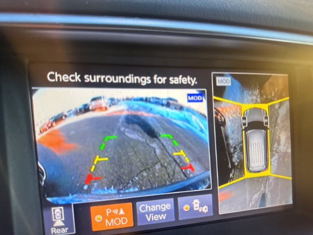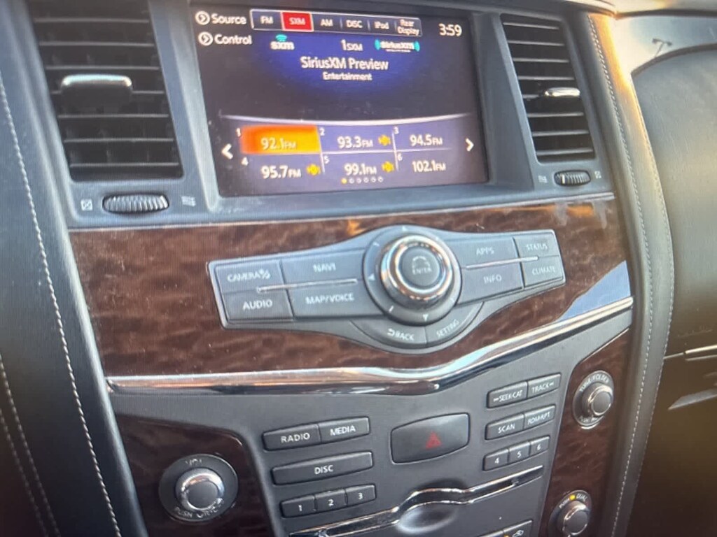 Technology and entertainment features include the AM/FM/SXM/CD/MP3/HD audio system, navigation system, 13 speakers, radio data system, A/V remote, headphones, HomeLink garage door transmitter, steeringwheel mounted controls, trip computer, rear reading lights, and NissanConnect emergency communication services.
