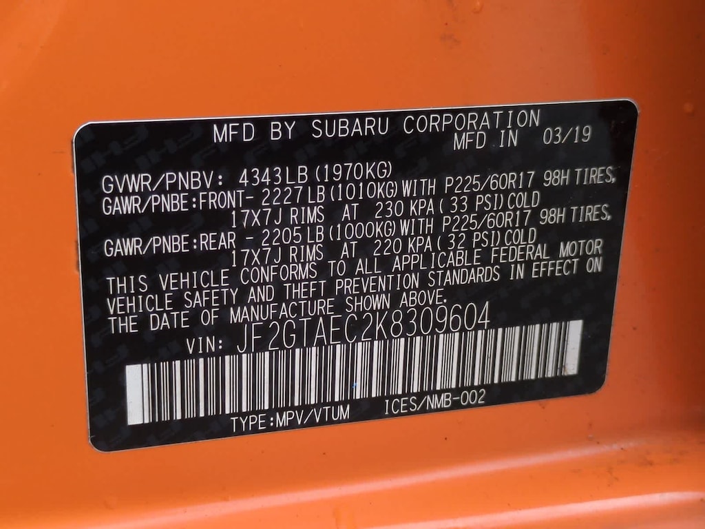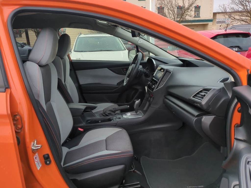 Clean CARFAX. Sunshine Orange 2019 Subaru Crosstrek 2.0i Premium AWD Lineartronic CVT 2.0L DOHC 17 Alloy Wheels, 3.90 Axle Ratio, 4-Wheel Disc Brakes, 6 Speakers, ABS brakes, Aero Crossbar Set, Air Conditioning, All-Weather Floor Liners, Alloy wheels, AM/FM radio: SiriusXM, Auto-Dimming Exterior Mirror w/Approach Light, Auto-Dimming Mirror w/Compass & HomeLink, Blind Spot Detection/Rear Cross Traffic Alert, Brake assist, Bumpers: body-color, CD player, Cloth Upholstery, Driver door bin, Driver vanity mirror, Dual front impact airbags, Dual front side impact airbags, Electronic Stability Control, Emergency communication system: STARLINK Safety and Security, Exterior Parking Camera Rear, EyeSight System, Four wheel independent suspension, Front anti-roll bar, Front Bucket Seats, Front Center Armrest, Front fog lights, Front reading lights, Fully automatic headlights, Heated door mirrors, Heated Front Bucket Seats, Heated front seats, High Grade Instrument Cluster w/Color LCD Display, Illuminated entry, Knee airbag, Leather Shift Knob, Low tire pressure warning, Map & Dome Lights LED Upgrade, Occupant sensing airbag, Outside temperature display, Overhead airbag, Overhead console, Overhead Console Shower Light, Panic alarm, Passenger door bin, Passenger vanity mirror, Popular Package #3, Power door mirrors, Power steering, Power windows, Radio data system, Radio: Subaru Starlink 6.5