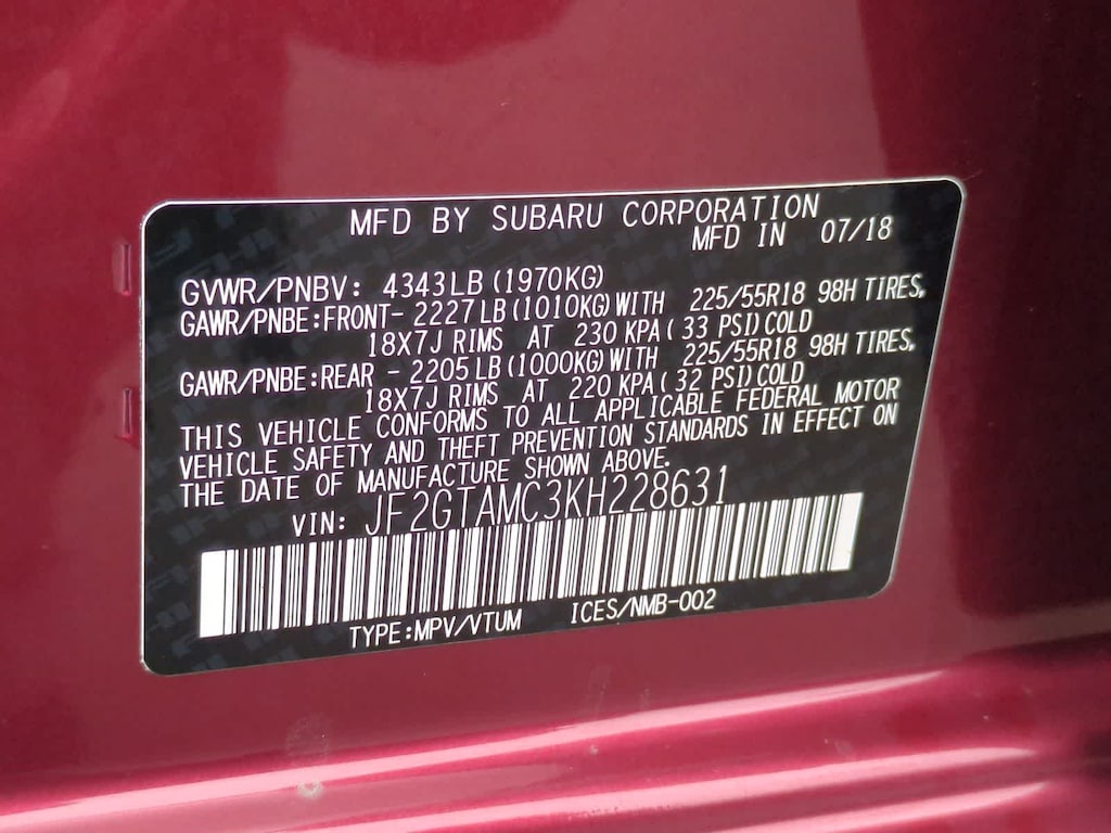 Venetian Red Pearl 2019 Subaru Crosstrek 2.0i Limited AWD Lineartronic CVT 2.0L DOHC 18 Alloy Wheels, 3.90 Axle Ratio, 4-Wheel Disc Brakes, 6 Speakers, ABS brakes, Air Conditioning, Alloy wheels, AM/FM radio: SiriusXM, Auto High-beam Headlights, Automatic temperature control, Brake assist, Bumpers: body-color, CD player, Driver door bin, Driver vanity mirror, Dual front impact airbags, Dual front side impact airbags, Electronic Stability Control, Emergency communication system: STARLINK Safety and Security, Exterior Parking Camera Rear, Four wheel independent suspension, Front anti-roll bar, Front Bucket Seats, Front Center Armrest, Front fog lights, Front reading lights, Fully automatic headlights, Heated door mirrors, Heated Front Bucket Seats, Heated front seats, Illuminated entry, Knee airbag, Leather Shift Knob, Leather-Trimmed Upholstery, Low tire pressure warning, Occupant sensing airbag, Outside temperature display, Overhead airbag, Overhead console, Panic alarm, Passenger door bin, Passenger vanity mirror, Power door mirrors, Power driver seat, Power steering, Power windows, Radio data system, Radio: Subaru Starlink 8.0 Multimedia Plus System, Rear anti-roll bar, Rear seat center armrest, Rear window defroster, Rear window wiper, Remote keyless entry, Roof rack: rails only, Security system, Speed control, Speed-sensing steering, Split folding rear seat, Spoiler, Standard Model, STARLINK/Apple CarPlay/Android Auto, Steering wheel mounted audio controls, Subaru Starlink Smartphone Integration, Tachometer, Telescoping steering wheel, Tilt steering wheel, Traction control, Trip computer, Turn signal indicator mirrors, Variably intermittent wipers.