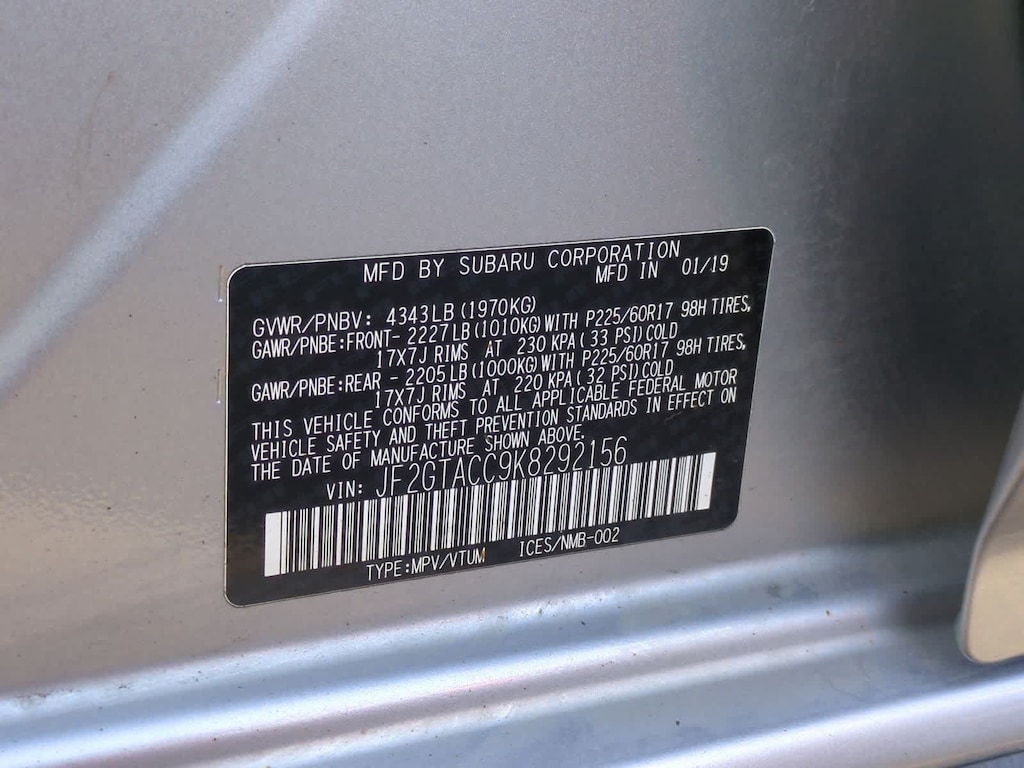 Ice Silver Metallic 2019 Subaru Crosstrek 2.0i Premium AWD Lineartronic CVT 2.0L DOHC 17 Alloy Wheels, 3.90 Axle Ratio, 4-Wheel Disc Brakes, 6 Speakers, ABS brakes, Air Conditioning, Alloy wheels, AM/FM radio: SiriusXM, Brake assist, Bumpers: body-color, CD player, Cloth Upholstery, Driver door bin, Driver vanity mirror, Dual front impact airbags, Dual front side impact airbags, Electronic Stability Control, Emergency communication system: STARLINK Safety and Security, Exterior Parking Camera Rear, Four wheel independent suspension, Front anti-roll bar, Front Bucket Seats, Front Center Armrest, Front fog lights, Front reading lights, Fully automatic headlights, Heated door mirrors, Heated Front Bucket Seats, Heated front seats, Illuminated entry, Knee airbag, Leather Shift Knob, Low tire pressure warning, Occupant sensing airbag, Outside temperature display, Overhead airbag, Overhead console, Panic alarm, Passenger door bin, Passenger vanity mirror, Power door mirrors, Power steering, Power windows, Radio data system, Radio: Subaru Starlink 6.5 Multimedia Plus System, Rear anti-roll bar, Rear window defroster, Rear window wiper, Remote keyless entry, Roof rack: rails only, Security system, Speed control, Speed-sensing steering, Split folding rear seat, Spoiler, Standard Model, STARLINK/Apple CarPlay/Android Auto, Steering wheel mounted audio controls, Subaru Starlink Smartphone Integration, Tachometer, Telescoping steering wheel, Tilt steering wheel, Traction control, Trip computer, Variably intermittent wipers.