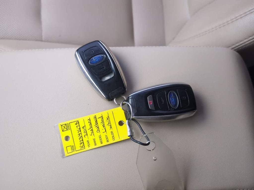 Clean CARFAX. Crystal White Pearl 2019 Subaru Outback 2.5i Limited AWD CVT Lineartronic 2.5L 4-Cylinder DOHC 16V 12 Speakers, 18 Alloy Wheels, 4-Wheel Disc Brakes, 4.111 Axle Ratio, ABS brakes, Air Conditioning, All-Weather Floor Liners, Alloy wheels, AM/FM radio: SiriusXM, Auto-Dimming Rear View Compass Mirror w/HomeLink, Auto-dimming Rear-View mirror, Automatic temperature control, Brake assist, Bumpers: body-color, CD player, Compass, Driver door bin, Driver vanity mirror, Dual front impact airbags, Dual front side impact airbags, Electronic Stability Control, Emergency communication system, Exterior Parking Camera Rear, Four wheel independent suspension, Front anti-roll bar, Front Bucket Seats, Front Center Armrest w/Storage, Front dual zone A/C, Front fog lights, Front reading lights, Fully automatic headlights, Garage door transmitter, harman/kardon Surround Sound Speaker System, harman/kardonî Speakers, Heated door mirrors, Heated Front Bucket Seats, Heated front seats, Heated rear seats, High Beam Assist (HBA), Illuminated entry, Leather Shift Knob, LED Steering Responsive Headlights, Low tire pressure warning, Map & Dome Lights LED Upgrade, Memory seat, Moonroof & Navigation & HBA & RAB & LED SRH, Occupant sensing airbag, Outside temperature display, Overhead airbag, Overhead console, Panic alarm, Passenger door bin, Passenger vanity mirror, Perforated Leather-Trimmed Upholstery, Popular Package #2, Power door mirrors, Power driver seat, Power Liftgate, Power Moonroof Package, Power passenger seat, Power steering, Power windows