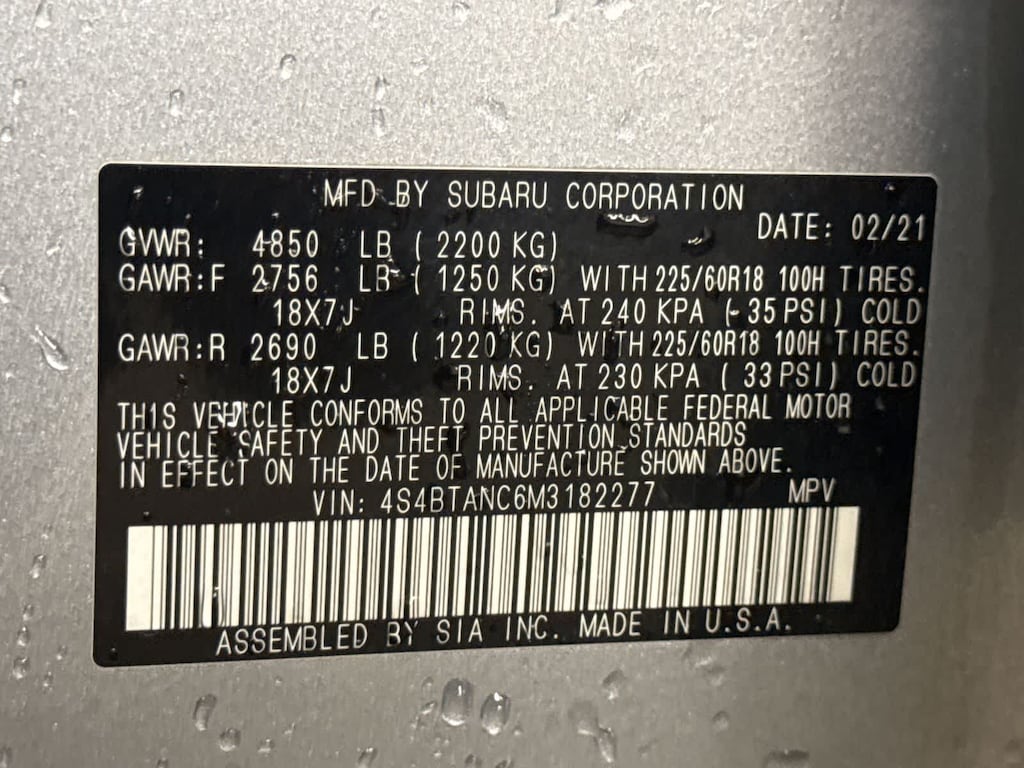 Clean CARFAX. Ice Silver Metallic 2021 Subaru Outback Limited AWD CVT Lineartronic 2.5L 4-Cylinder DOHC 16V 12 Speakers, 3.90 Axle Ratio, 4-Wheel Disc Brakes, ABS brakes, Air Conditioning, Alloy wheels, AM/FM radio: SiriusXM, Auto High-beam Headlights, Auto-dimming Rear-View mirror, Automatic temperature control, Brake assist, Bumpers: body-color, Compass, Driver door bin, Driver vanity mirror, Dual front impact airbags, Dual front side impact airbags, Electronic Stability Control, Emergency communication system: STARLINK Safety and Security (Subscription Required), Exterior Parking Camera Rear, Four wheel independent suspension, Front anti-roll bar, Front Bucket Seats, Front Center Armrest w/Storage, Front dual zone A/C, Front fog lights, Front reading lights, Fully automatic headlights, Garage door transmitter: HomeLink, harman/kardon Surround Sound Speaker System, harman/kardonî Speakers, Heated door mirrors, Heated Front Bucket Seats, Heated front seats, Heated rear seats, Illuminated entry, Knee airbag, Leather steering wheel, Low tire pressure warning, Memory seat, Occupant sensing airbag, Outside temperature display, Overhead airbag, Overhead console, Panic alarm, Passenger door bin, Passenger vanity mirror, Perforated Leather-Trimmed Upholstery, Power door mirrors, Power driver seat, Power Liftgate, Power passenger seat, Power steering, Power windows, Radio: Subaru STARLINK 11.6 Multimedia Plus Sys, Rear anti-roll bar, Rear seat center armrest, Rear window defroster, Rear window wiper, Remote keyless entry, Roof rack, Security system, Speed control, Speed-sensing steering, Split folding rear seat, Spoiler, STARLINK/Apple CarPlay/Android Auto, Steering wheel mounted audio controls, Steering Wheel Paddle Shift Control Switches, Tachometer, Telescoping steering wheel, Tilt steering wheel, Traction control, Trip computer, Turn signal indicator mirrors, Variably intermittent wipers, Wheels: 18 x 7J Black Aluminum Alloy.