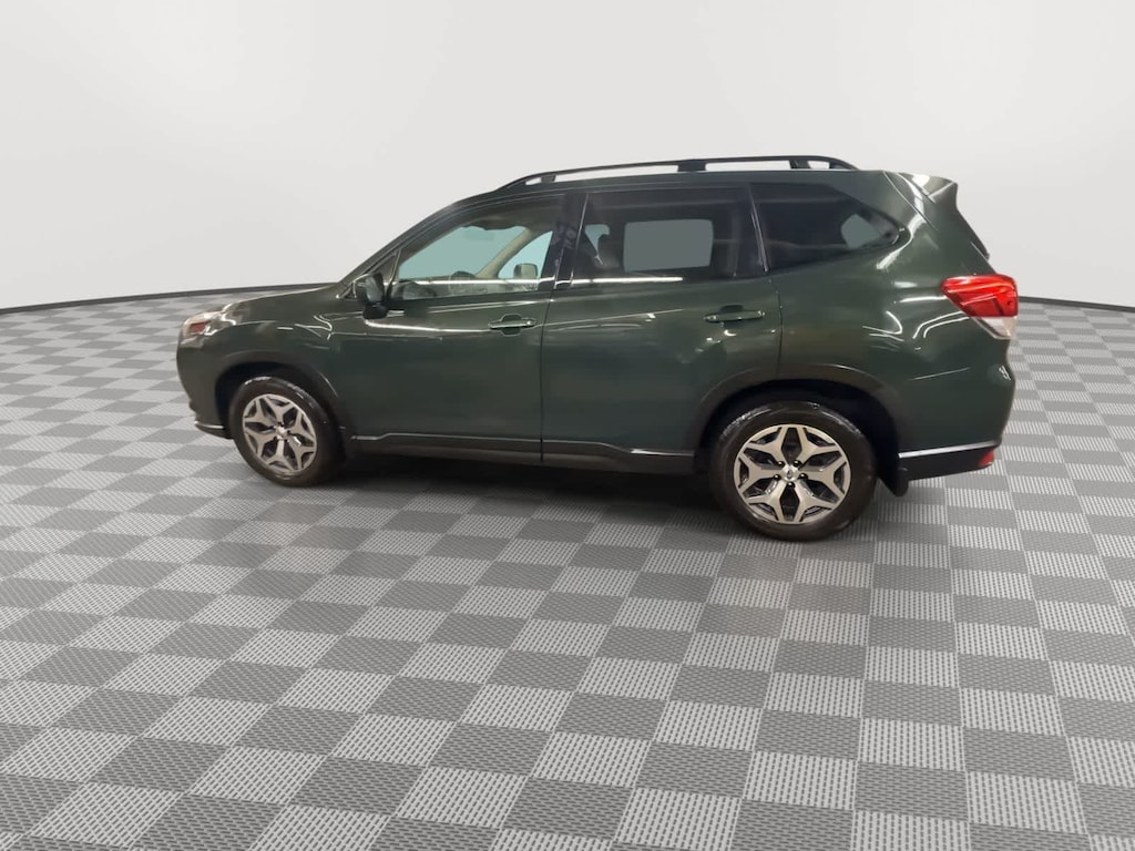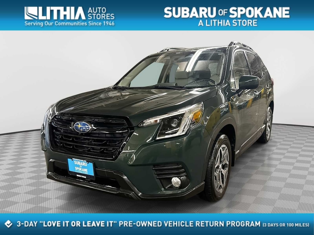 CARFAX One-Owner. Cascade Green Silica 2023 Subaru Forester Premium AWD Lineartronic CVT 2.5L 4-Cylinder DOHC 16V 3.70 Axle Ratio, 4-Wheel Disc Brakes, 6 Speakers, ABS brakes, Air Conditioning, Alloy wheels, AM/FM radio: SiriusXM, Anti-whiplash front head restraints, Auto High-beam Headlights, Automatic temperature control, Brake assist, Bumpers: body-color, Cargo Sidewall Protector, CD player, Driver door bin, Driver vanity mirror, Dual front impact airbags, Dual front side impact airbags, Electronic Stability Control, Emergency communication system: STARLINK Safety and Security (Subscription Required), Exterior Parking Camera Rear, Four wheel independent suspension, Front anti-roll bar, Front Bucket Seats, Front Center Armrest, Front fog lights, Front reading lights, Fully automatic headlights, Heated door mirrors, Heated Front Bucket Seats, Heated front seats, Illuminated entry, Knee airbag, Low tire pressure warning, Occupant sensing airbag, Outside temperature display, Overhead airbag, Overhead console, Panic alarm, Passenger door bin, Passenger vanity mirror, Power door mirrors, Power driver seat, Power moonroof: Panoramic, Power steering, Power windows, Premium Cloth Upholstery, Radio data system, Radio: Subaru Starlink 6.5 Multimedia Plus System, Rear anti-roll bar, Rear Bumper Cover, Rear seat center armrest, Rear window defroster, Rear window wiper, Remote keyless entry, Roof rack: rails only, Security system, Speed control, Speed-sensing steering, Splash Guards, Split folding rear seat, Spoiler, Standard Model, STARLINK/Apple CarPlay/Android Auto, Steering wheel mounted audio controls, Tachometer, Telescoping steering wheel, Tilt steering wheel, Traction control, Trip computer, Variably intermittent wipers, Wheels: 17 x 7.0 J Black Machine Finish Alloy.