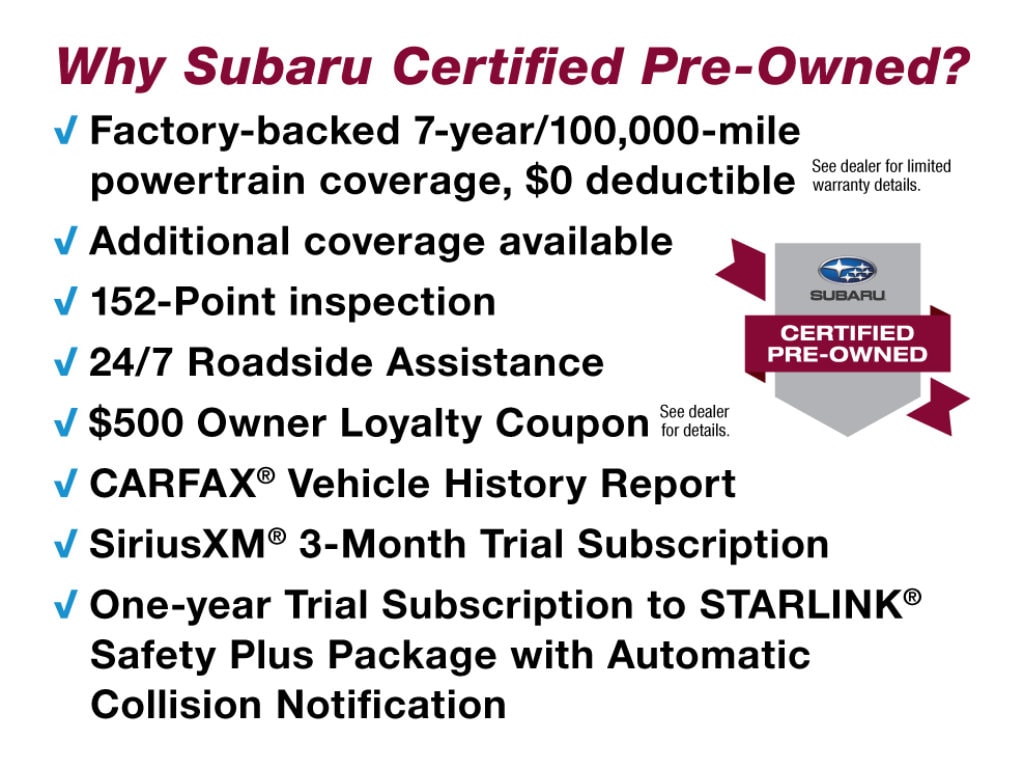 As a Subaru Certified Pre-Owned vehicle, this Outback has passed a 152-point inspection and includes a 7-year/100,000-mile powertrain limited warranty, roadside assistance, and a CARFAX vehicle history reportgiving you long-term confidence in your purchase.