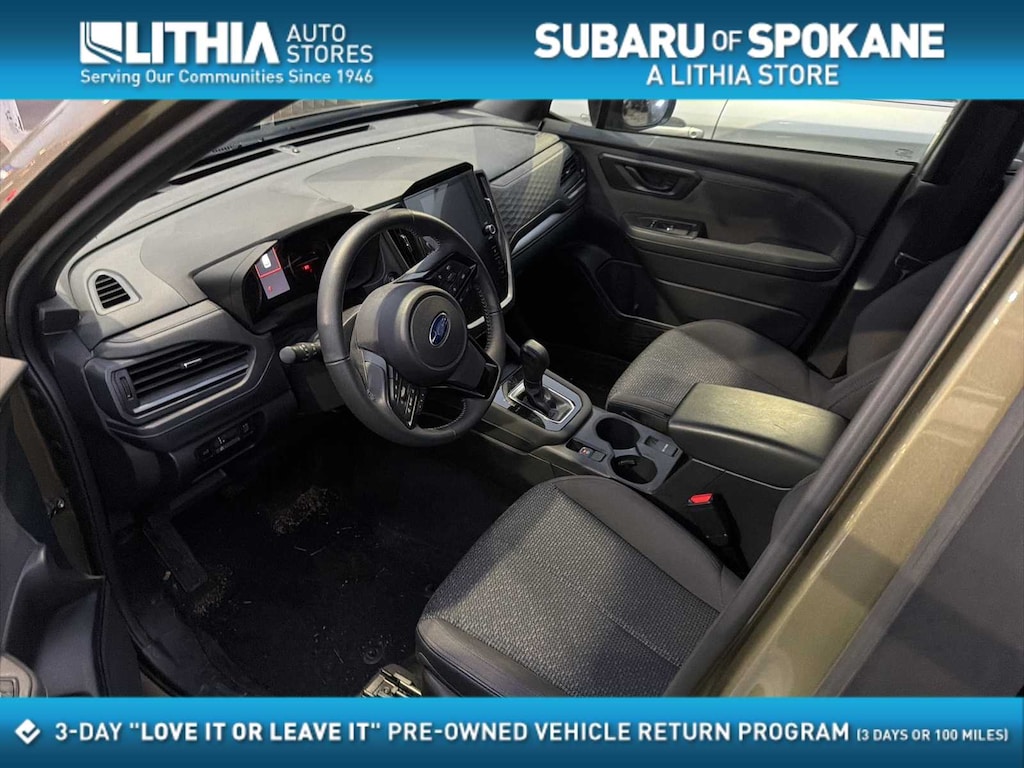 Clean CARFAX. Autumn Green Metallic 2025 Subaru Forester Premium AWD Lineartronic CVT 2.5L 4-Cylinder DOHC 16V 4-Wheel Disc Brakes, 6 Speakers, ABS brakes, Air Conditioning, Alloy wheels, AM/FM radio: SiriusXM with 360L, Anti-whiplash front head restraints, Auto High-beam Headlights, Auto-Dimming Exterior Mirror w/Approach Light, Auto-Dimming Mirror w/Compass & HomeLink, Automatic Emergency Steering, Automatic temperature control, Blind-Spot Detection (BSD)/RCTA System, Brake assist, Bumpers: body-color, Driver door bin, Driver vanity mirror, Dual front impact airbags, Dual front side impact airbags, Electronic Stability Control, Emergency communication system: MySubaru Safety (3-year free trial), Exterior Parking Camera Rear, Four wheel independent suspension, Front anti-roll bar, Front Bucket Seats, Front Center Armrest, Front dual zone A/C, Front fog lights, Front reading lights, Fully automatic headlights, Heated door mirrors, Heated Front Bucket Seats, Heated front seats, Illuminated entry, Knee airbag, Leather steering wheel, LED Upgrade, Low tire pressure warning, Occupant sensing airbag, Outside temperature display, Overhead airbag, Overhead console, Panic alarm, Passenger door bin, Passenger vanity mirror, Power door mirrors, Power driver seat, Power moonroof: Panoramic, Power Rear Gate, Power Rear Gate & Blind Spot Detection w/RCTA, Power steering, Power windows, Premium Textured Cloth Upholstery, Radio data system, Radio: Subaru 11.6 Multimedia Plus System, Rear anti-roll bar, Rear seat center armrest, Rear window defroster, Rear window wiper, Remote keyless entry, Security system, Speed control, Speed-sensing steering, Split folding rear seat, Spoiler, Steering wheel mounted audio controls, Tachometer, Telescoping steering wheel, Tilt steering wheel, Traction control, Trip computer, Variably intermittent wipers, Wheels: 17 x 7.0 J Dark Metallic Aluminum-Alloy.