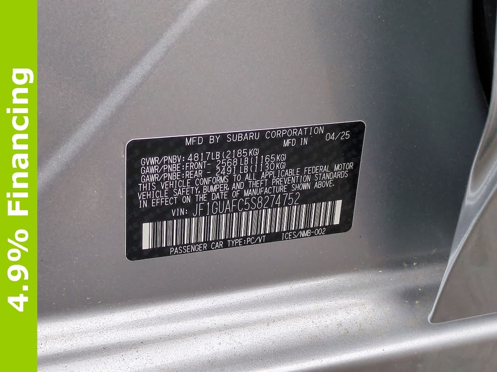 Ice Silver Metallic 2025 Subaru Impreza Sport AWD CVT Lineartronic 2.0L DOHC 4-Wheel Disc Brakes, 6 Speakers, ABS brakes, Air Conditioning, All Weather Package, Alloy wheels, Anti-whiplash front head restraints, Auto High-beam Headlights, Auto-Dimming Exterior Mirror w/Approach Light, Auto-Dimming Mirror w/Compass & HomeLink, Automatic temperature control, Blind Spot Detection (BSD), Brake assist, BSD/RCTA & All Weather Pkg & Power Moonroof, Bumpers: body-color, Driver door bin, Driver vanity mirror, Dual front impact airbags, Dual front side impact airbags, Dual-Mode Heated Front Seats, Electronic Stability Control, Exterior Parking Camera Rear, Four wheel independent suspension, Front anti-roll bar, Front Bucket Seats, Front Center Armrest, Front dual zone A/C, Front fog lights, Front reading lights, Fully automatic headlights, Heated Exterior Power Mirrors, Illuminated entry, Knee airbag, LED Upgrade (15G), Low tire pressure warning, Occupant sensing airbag, Outside temperature display, Overhead airbag, Overhead console, Panic alarm, Passenger door bin, Passenger vanity mirror, Power door mirrors, Power Moonroof, Power steering, Power windows, Premium Sport Cloth Upholstery, Radio data system, Rear anti-roll bar, Rear Cross-Traffic Alert (RCTA) System, Rear seat center armrest, Rear window defroster, Rear window wiper, Remote keyless entry, Security system, Speed control, Speed-sensing steering, Split folding rear seat, Spoiler, Steering wheel mounted audio controls, Sun Visors w/Vanity Mirror & Lights, Tachometer, Telescoping steering wheel, Tilt steering wheel, Traction control, Trip computer, Turn signal indicator mirrors, Variably intermittent wipers, Wheels: 18 x 7.0 J Machine Finish Aluminum-Alloy, Windshield Wiper De-Icer.