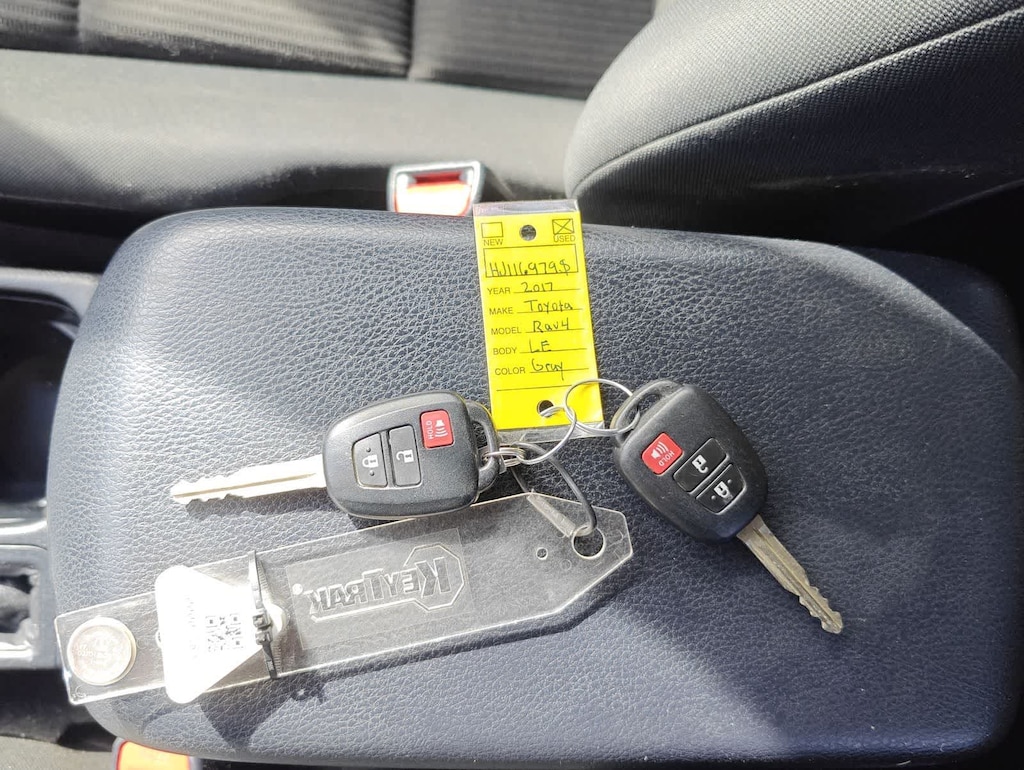 Magnetic Gray Metallic 2017 Toyota RAV4 LE AWD 6-Speed Automatic 2.5L 4-Cylinder DOHC Dual VVT-i AWD, Black Cloth, 4-Wheel Disc Brakes, 4.071 Axle Ratio, 6 Speakers, ABS brakes, Air Conditioning, AM/FM radio, Auto High-beam Headlights, Brake assist, Bumpers: body-color, CD player, Driver door bin, Driver vanity mirror, Dual front impact airbags, Dual front side impact airbags, Electronic Stability Control, Exterior Parking Camera Rear, Fabric Seat Trim, Four wheel independent suspension, Front anti-roll bar, Front Bucket Seats, Front Center Armrest, Front reading lights, Fully automatic headlights, Illuminated entry, Knee airbag, Low tire pressure warning, Occupant sensing airbag, Outside temperature display, Overhead airbag, Overhead console, Panic alarm, Passenger door bin, Passenger vanity mirror, Power door mirrors, Power steering, Power windows, Radio data system, Radio: Entune AM/FM/CD/MP3/WMA Playback w/6 Speakers, Rear anti-roll bar, Rear seat center armrest, Rear window defroster, Rear window wiper, Remote keyless entry, Speed control, Speed-sensing steering, Split folding rear seat, Spoiler, Steering wheel mounted audio controls, Tachometer, Telescoping steering wheel, Tilt steering wheel, Traction control, Trip computer, Wheels: 17 x 6.5J, AWD, Black