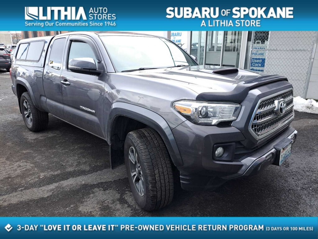 Clean CARFAX. Charcoal 2017 Toyota Tacoma 4WD 6-Speed V6 4WD, 6 Speakers, ABS brakes, Air Conditioning, Alloy wheels, AM/FM radio: SiriusXM, Anti-whiplash front head restraints, Auto-dimming Rear-View mirror, Brake assist, Bumpers: body-color, CD player, Compass, Driver door bin, Dual front impact airbags, Dual front side impact airbags, Electronic Stability Control, Exterior Parking Camera Rear, Front anti-roll bar, Front Bucket Seats, Front Center Armrest, Front fog lights, Front reading lights, Front wheel independent suspension, Illuminated entry, Knee airbag, Low tire pressure warning, Occupant sensing airbag, Outside temperature display, Overhead airbag, Overhead console, Panic alarm, Passenger cancellable airbag, Passenger door bin, Power steering, Power windows, Radio: Entune Premium w/AM/FM/CD/Nav/App Suite, Rear step bumper, Remote keyless entry, Speed control, Speed-sensing steering, Steering wheel mounted audio controls, Tachometer, Telescoping steering wheel, Tilt steering wheel, Traction control, Trip computer, Variably intermittent wipers, 4WD.