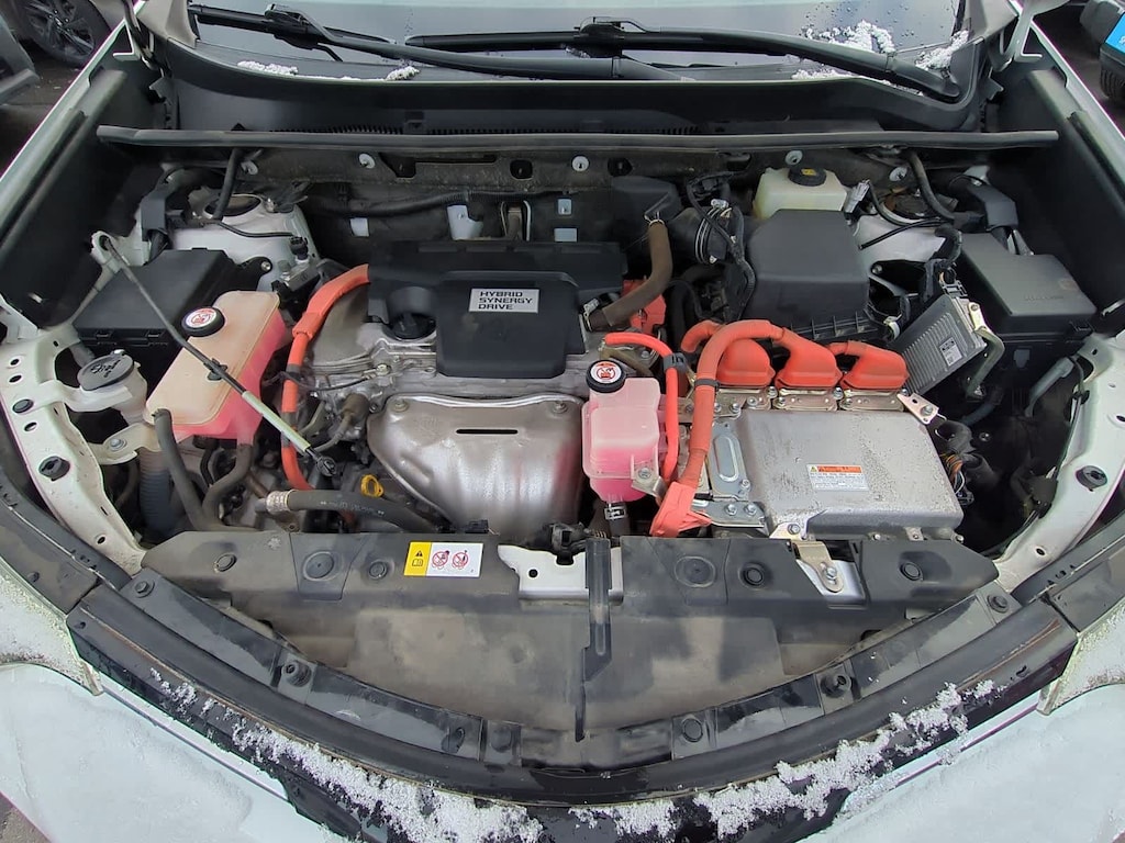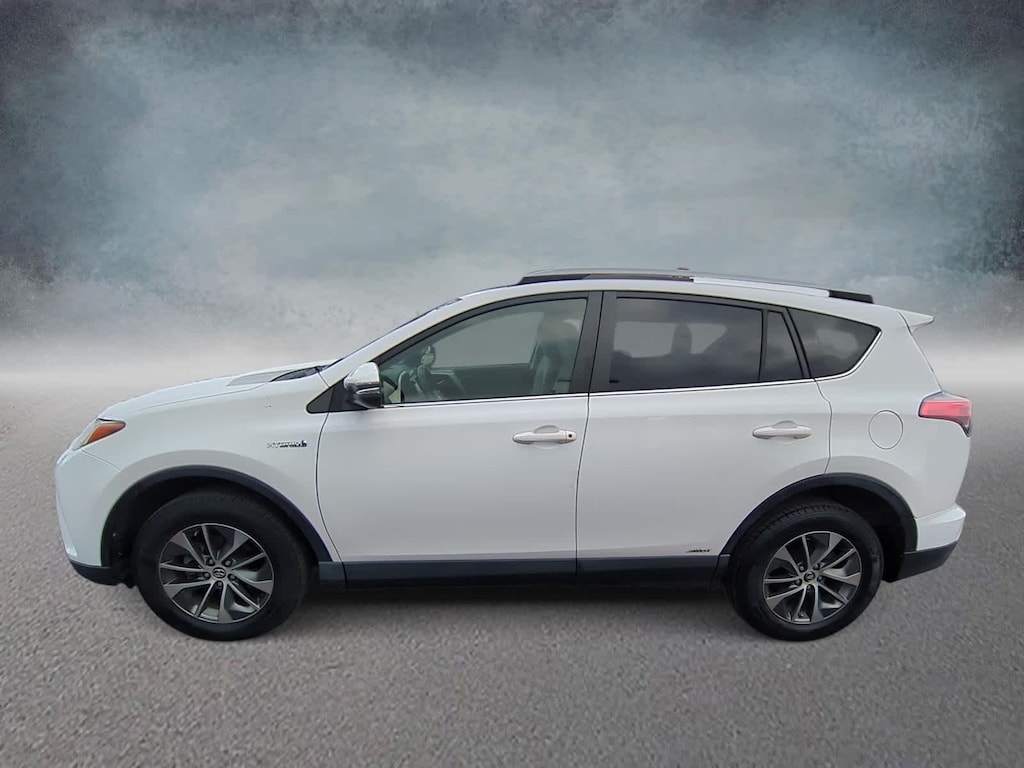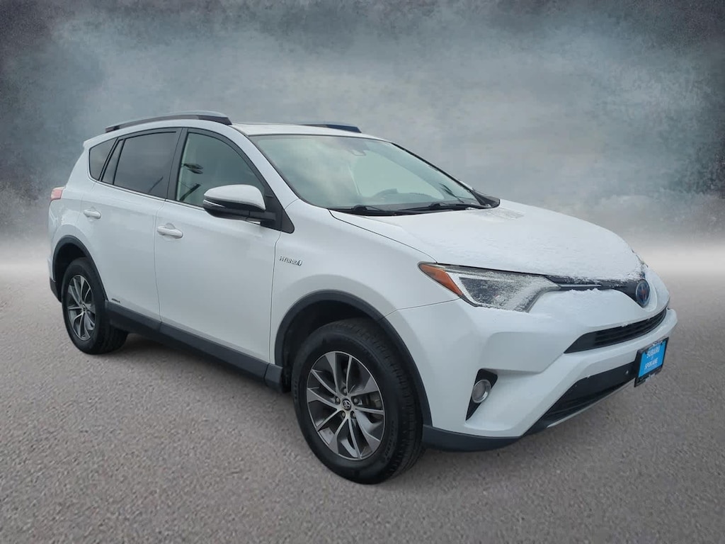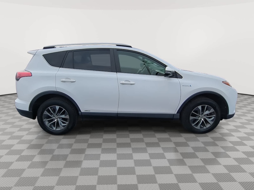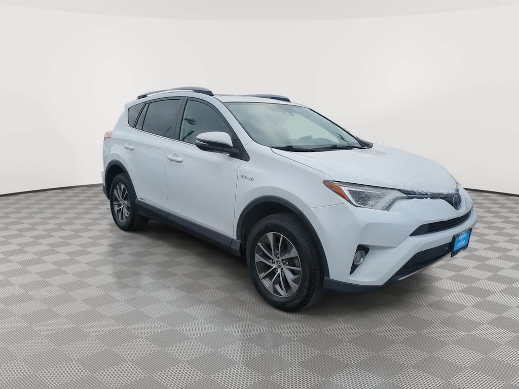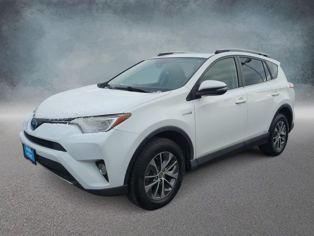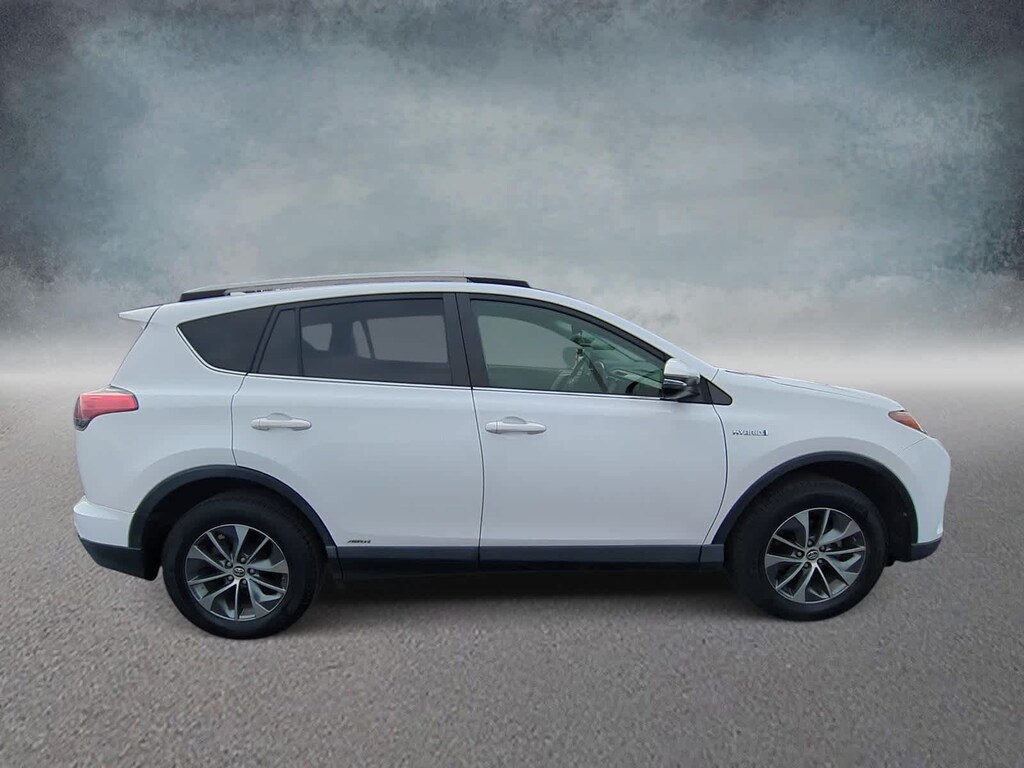CARFAX One-Owner. Clean CARFAX. White 2018 Toyota RAV4 Hybrid XLE AWD CVT 2.5L 4-Cylinder 2.5L 4-Cylinder, 4-Wheel Disc Brakes, 6 Speakers, ABS brakes, Air Conditioning, Alloy wheels, AM/FM radio: SiriusXM, Auto High-beam Headlights, Automatic temperature control, Axle Ratio: 3.542, Brake assist, Bumpers: body-color, CD player, Driver door bin, Driver vanity mirror, Dual front impact airbags, Dual front side impact airbags, Electronic Stability Control, Exterior Parking Camera Rear, Fabric Seat Trim, Four wheel independent suspension, Front anti-roll bar, Front Bucket Seats, Front Center Armrest, Front dual zone A/C, Front fog lights, Front reading lights, Front Sport Seats, Fully automatic headlights, Heated door mirrors, Illuminated entry, Knee airbag, Leather steering wheel, Low tire pressure warning, Occupant sensing airbag, Outside temperature display, Overhead airbag, Overhead console, Panic alarm, Passenger door bin, Passenger vanity mirror, Power door mirrors, Power moonroof, Power steering, Power windows, Radio data system, Radio: Entune Audio Plus AM/FM/MP3/WMA Playback, Rear anti-roll bar, Rear seat center armrest, Rear window defroster, Rear window wiper, Remote keyless entry, Roof rack, Speed control, Speed-sensing steering, Split folding rear seat, Spoiler, Steering wheel mounted audio controls, Telescoping steering wheel, Tilt steering wheel, Traction control, Trip computer, Turn signal indicator mirrors, Variably intermittent wipers, Wheels: 17 x 7.0J 5-Spoke Alloy, 2.5L 4-Cylinder.